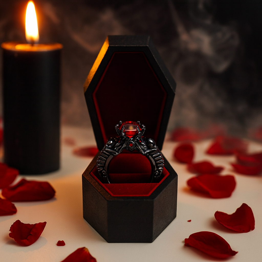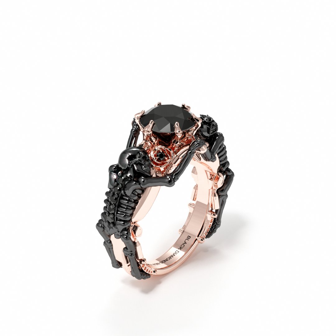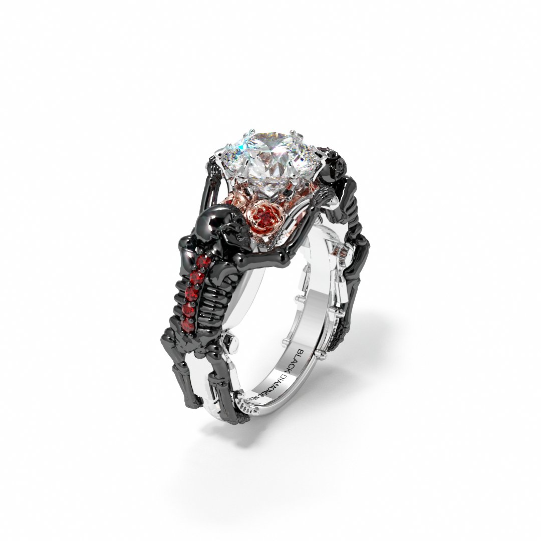 Dazzle your better half with the gothic promise ring, the "My Ride or Die Promise Ring (Biker Series)" by Black Diamonds New York. This unique ring is a bold statement for daring biker couples and motorbike lovers who pledge their love on the thrilling lap of adventure. The ring features skeleton lovers circling a black rose with a red diamond at the core. Black rings sparkle on the durable 14k gold body, encapsulating the spirit of a sturdy love that knows no fear. This is truly a one of a kind design, tailored strategically for those love stories where adventure takes the reign.