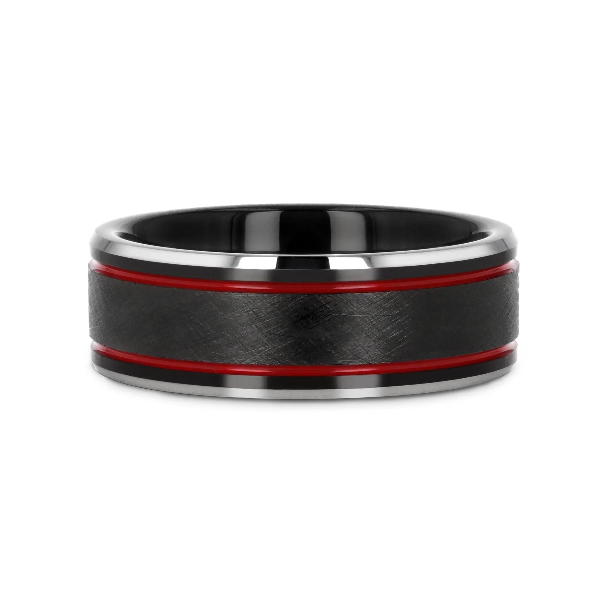 OLIS Wire Finish Black Tungsten Men’s Wedding Band with Double Red Stripes, Polished Beveled Edges – 8mm