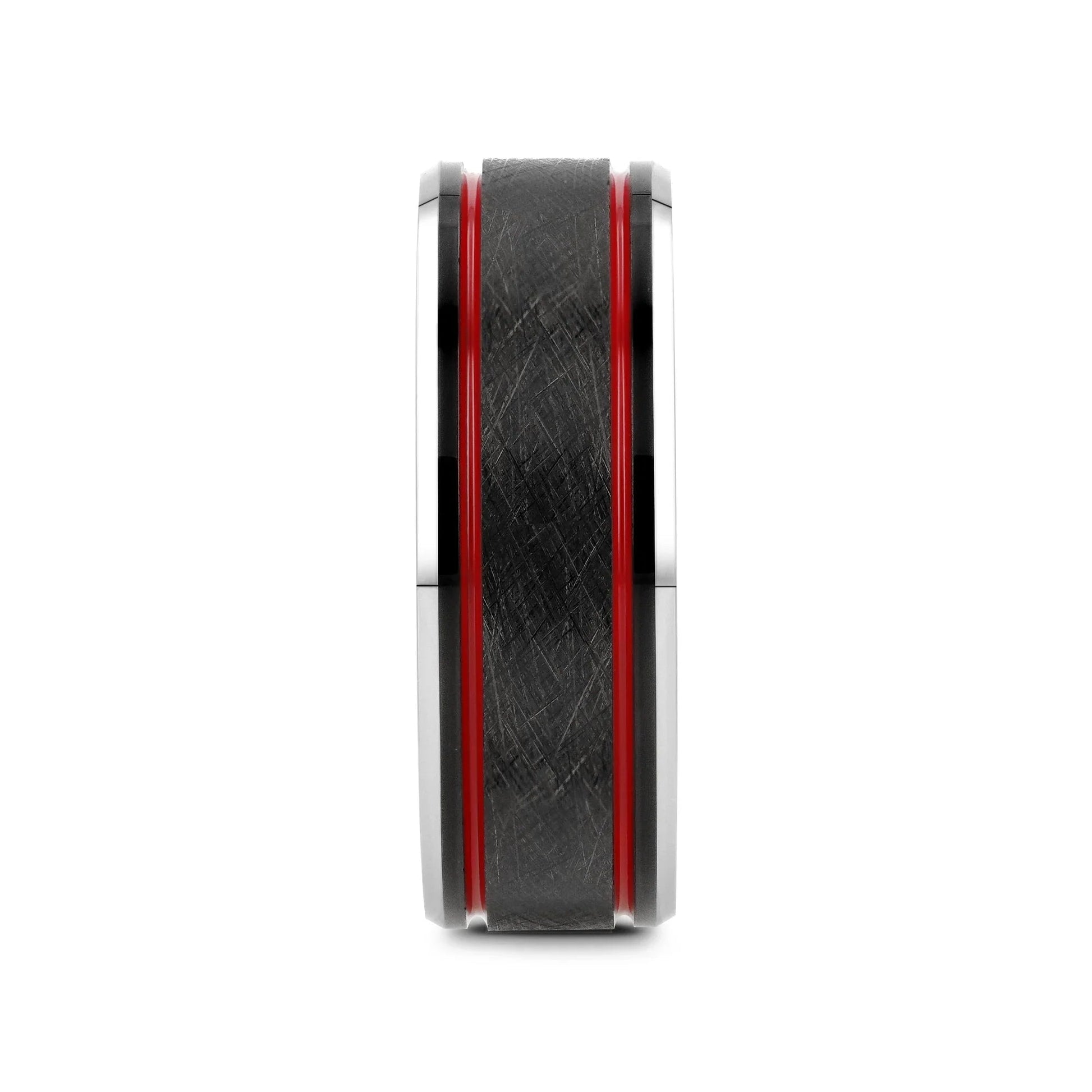 OLIS Wire Finish Centered Black Tungsten Men's Wedding Band With Double Red Stripe Polished Beveled Edges - 8mm