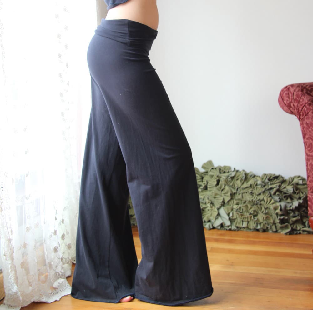 A foldover lounge pant with wide palazzo leg holes in soft lightweight organic cotton jersey, wear up or folded down