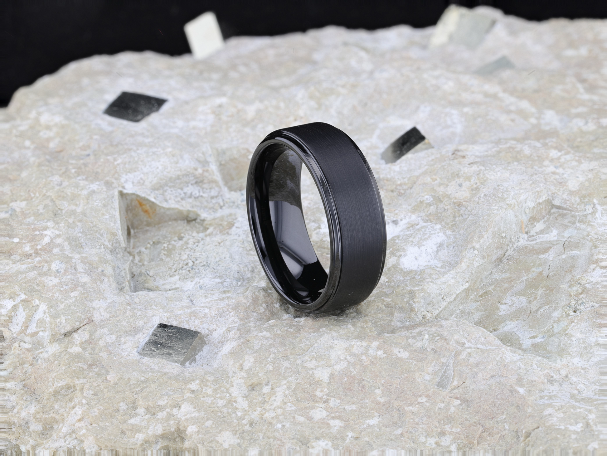 Minimally designed yet jaw dropping. This flat pipe-cut shape black Tungsten Carbide ring by Thorsten features a brush finished raised center with polished step edges.