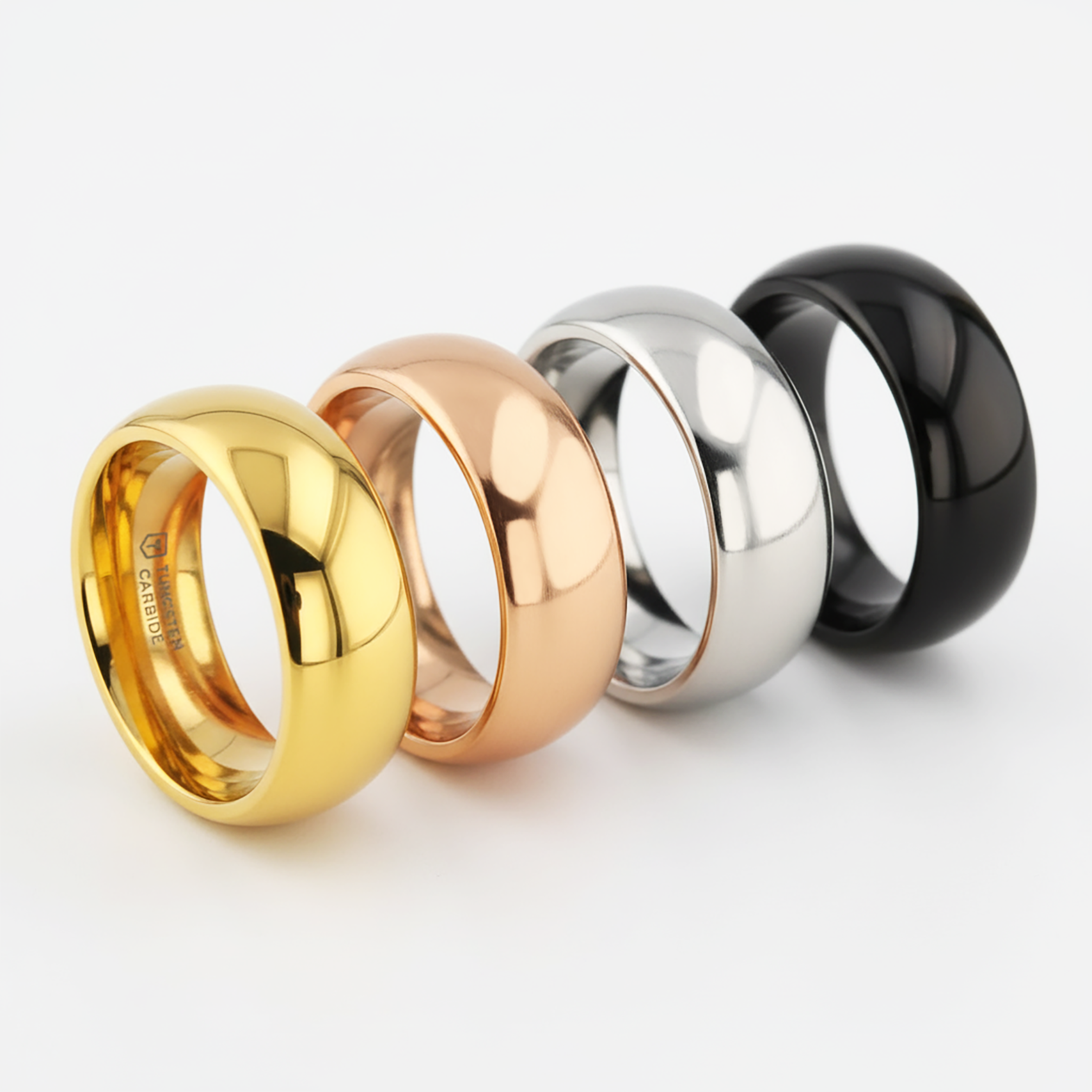 The classic domed style Tungsten Carbide wedding band by Thorsten is finally available as a gold tungsten wedding band. This ring has a rich gold-plated finish to give it a brilliant gold-yellow hue.