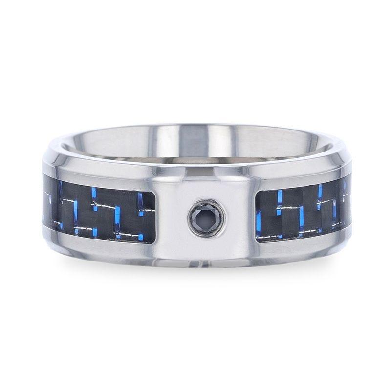 - Titanium band with a black and blue carbon fiber inlay, black sapphire center stone, and polished, beveled edges.