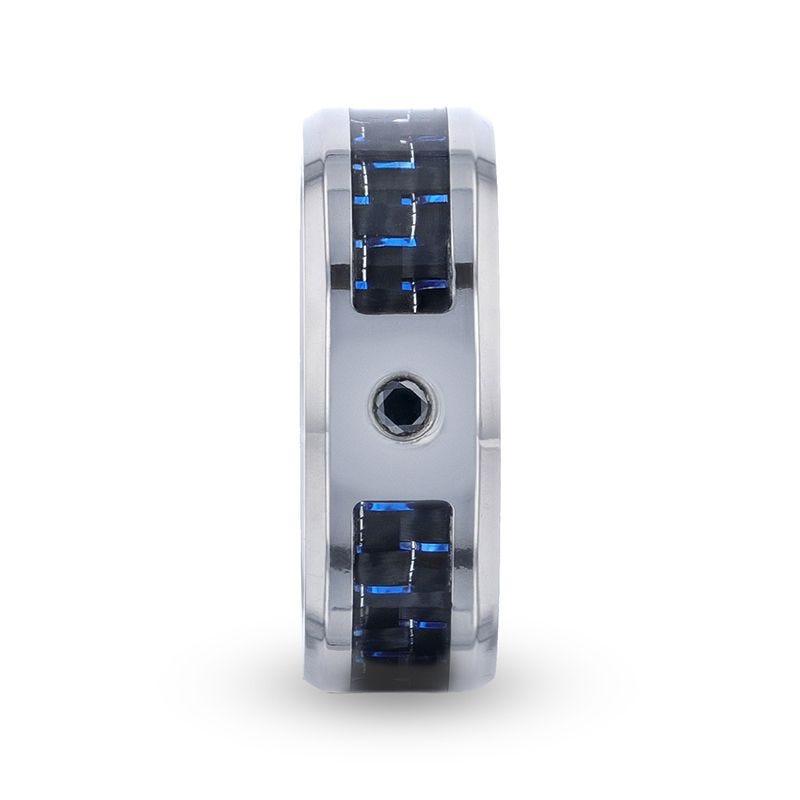 PACIFIC Black And Blue Carbon Fiber Inlaid Titanium Men's Wedding Band With Beveled Polished Edges and Black Sapphire Center Stone - 8mm