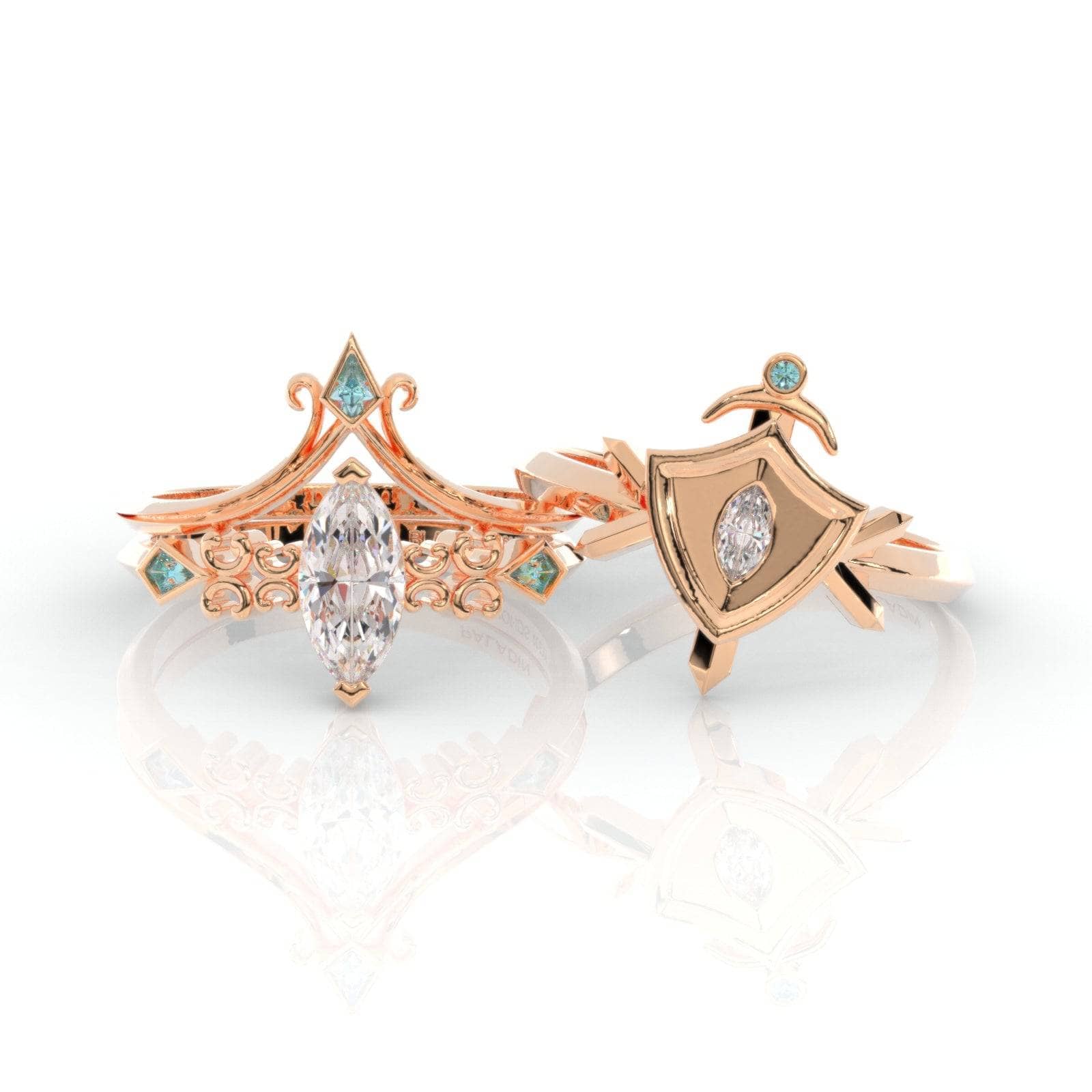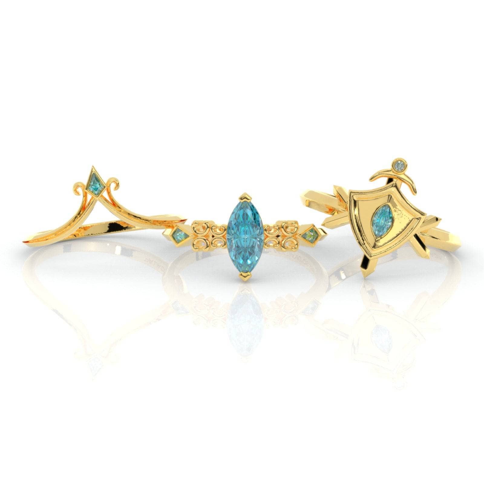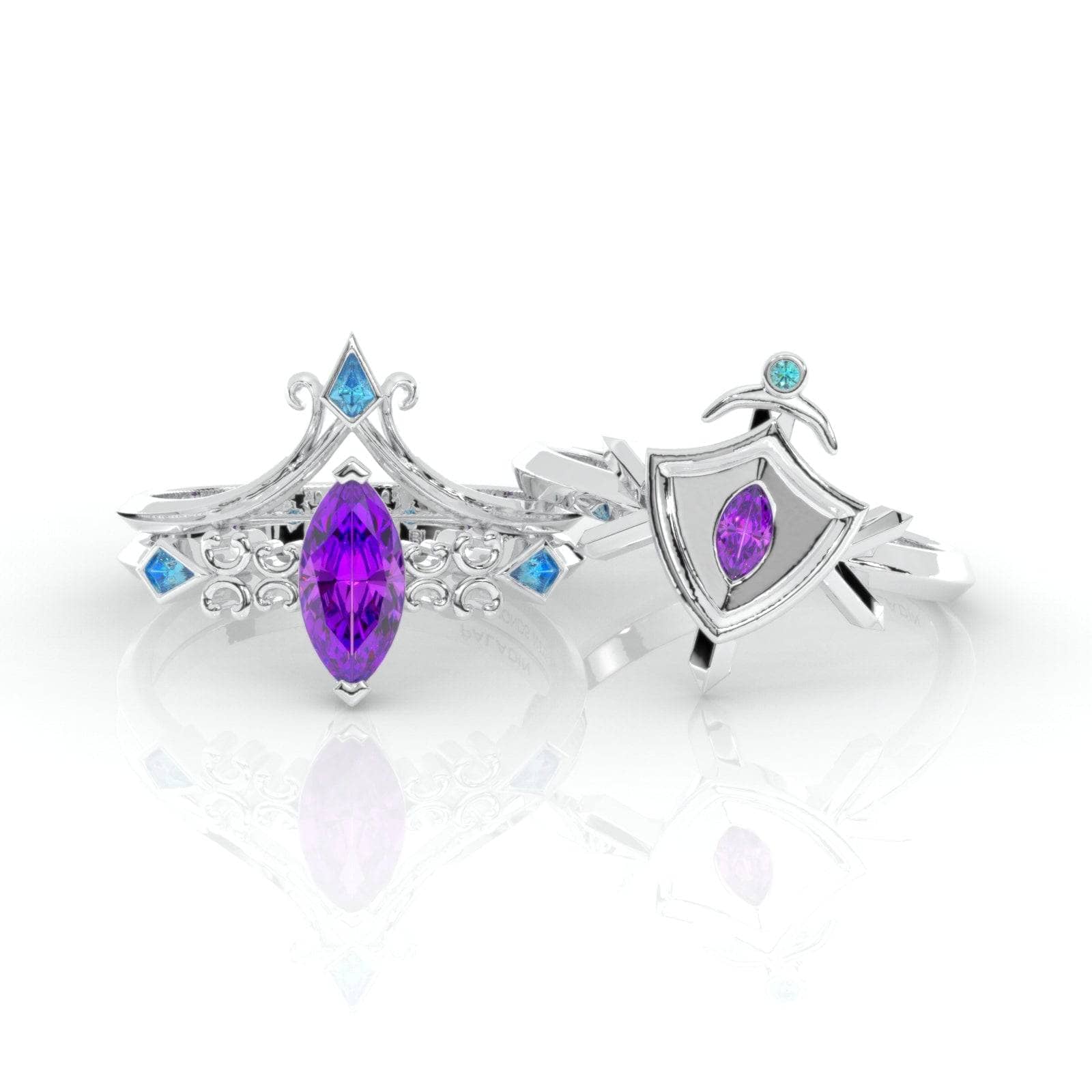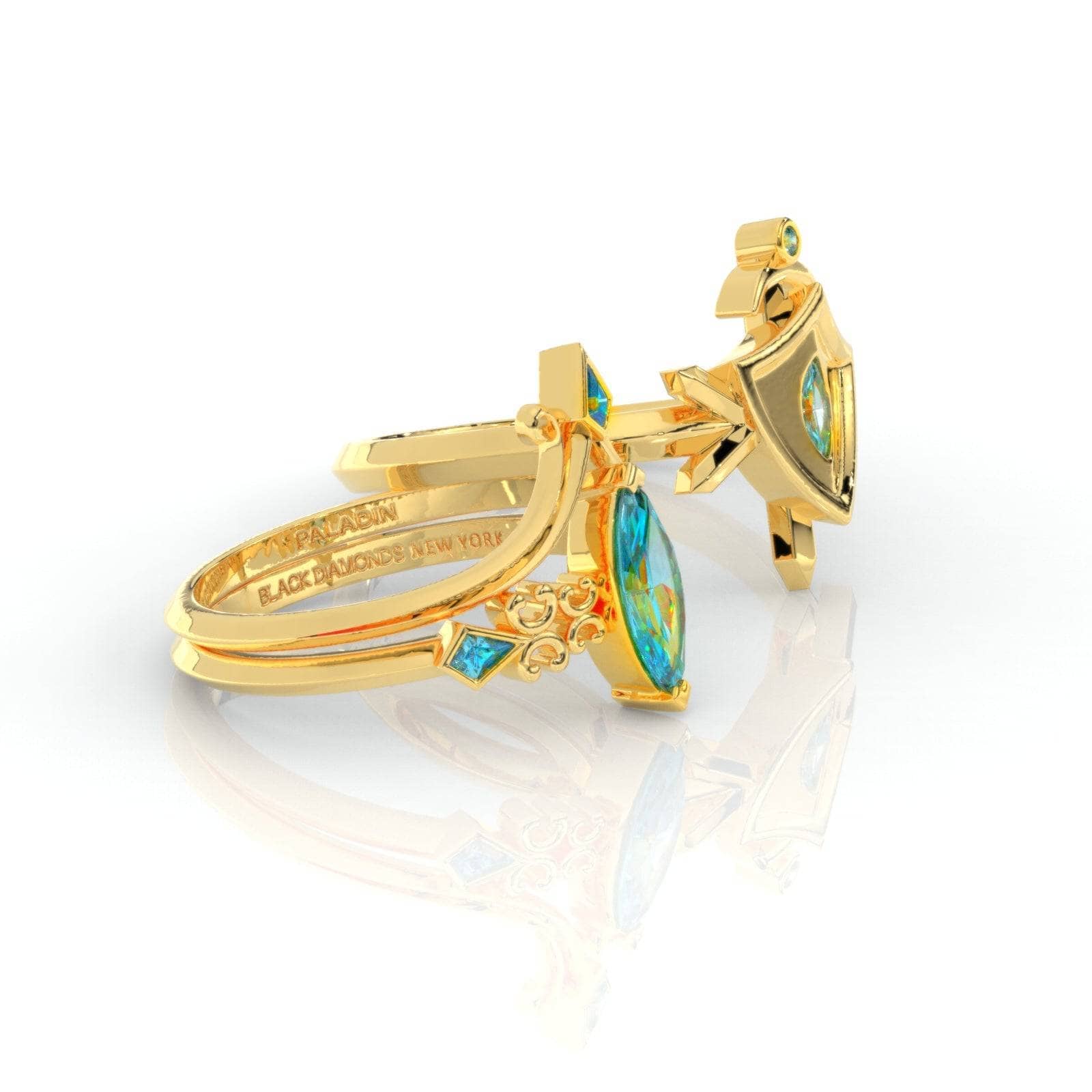 You wanted something different but matches your Paladin princess? We got you! Make way for this powerful Paladin's Shield Ring! This piece is nothing but unique. Specially handcrafted to compliment and protect your Paladin princess. Handcrafted in a custom shield shape with magical sword accent set in durable 14k gold with our custom cut marquise. This ring is inspired by your favorite Paladin character’s special skillset. Go on and rep this one-of-a-kind Paladin’s ring. Show the world the champion you are!