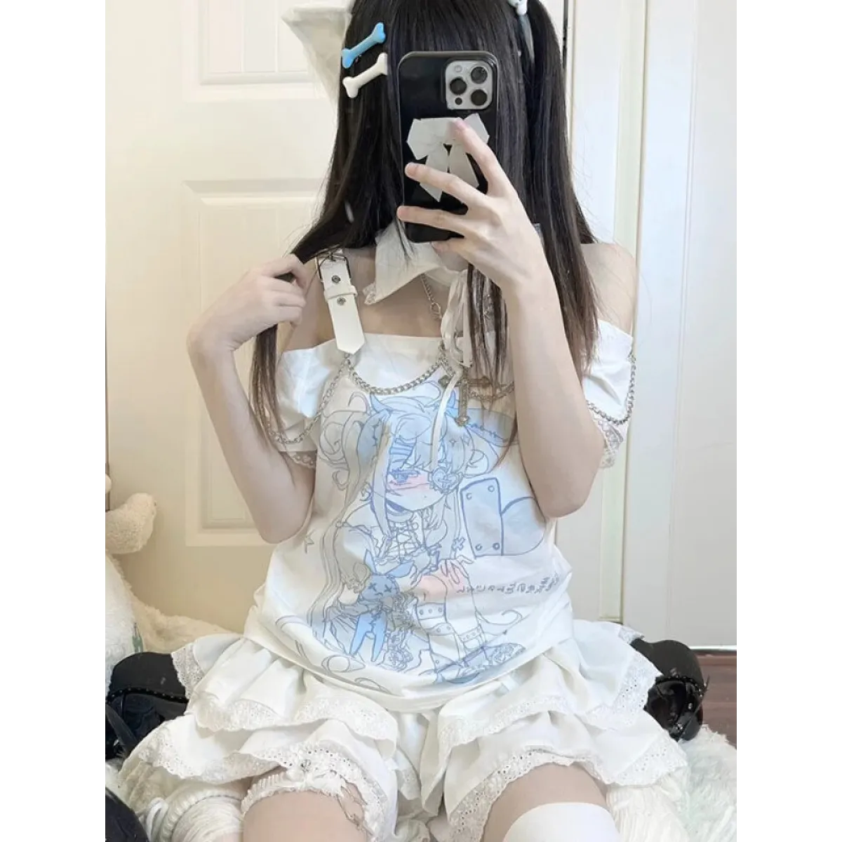 👗 Styling Tip 🌸 Show off your unique style by pairing this Pastel Menhera Off The Shoulder Tee with high-waisted jeans or a skirt. Its ACGN-inspired design and chain decoration add a touch of edginess to your look. Complete your outfit with some streetwear accessories for the perfect street-style ensemble.