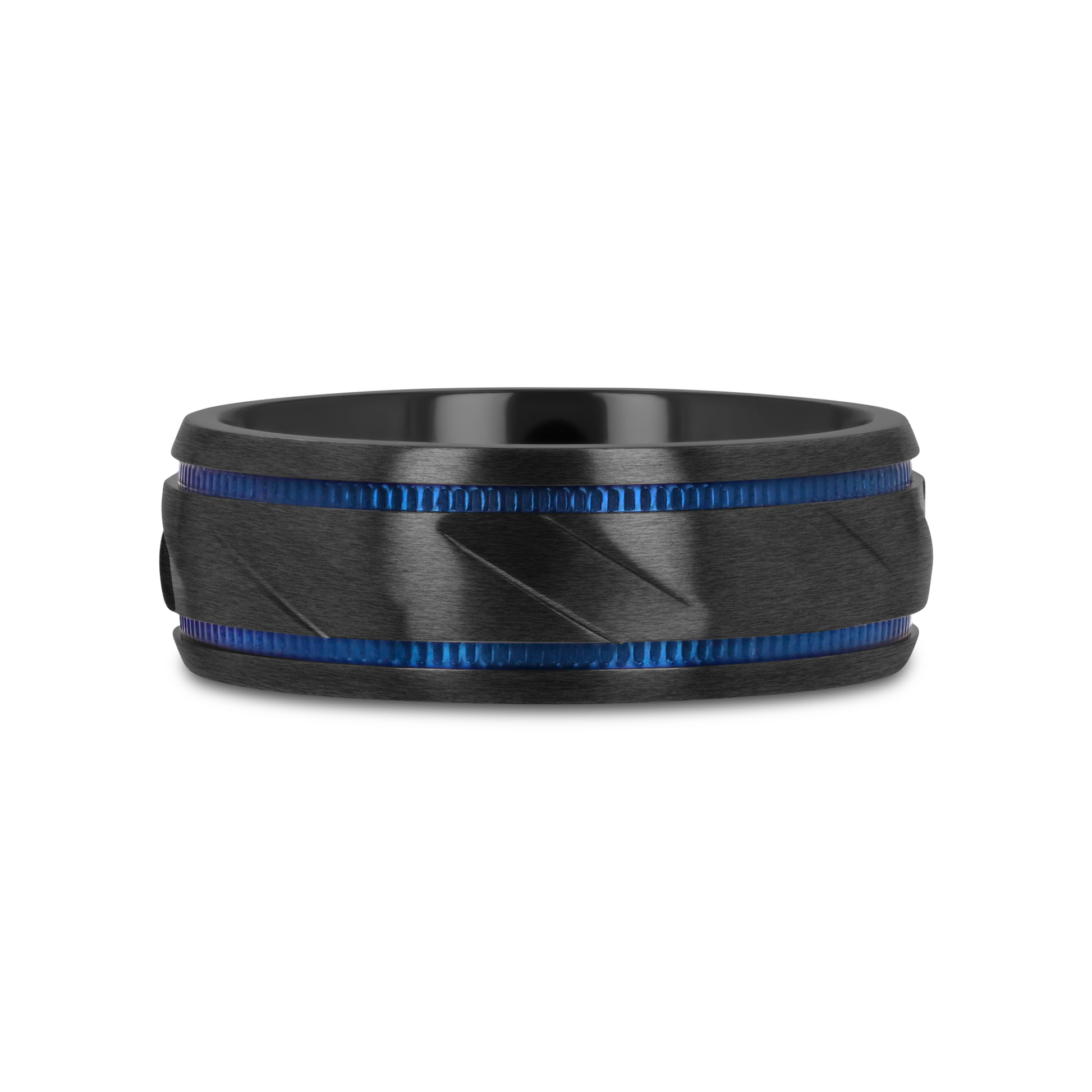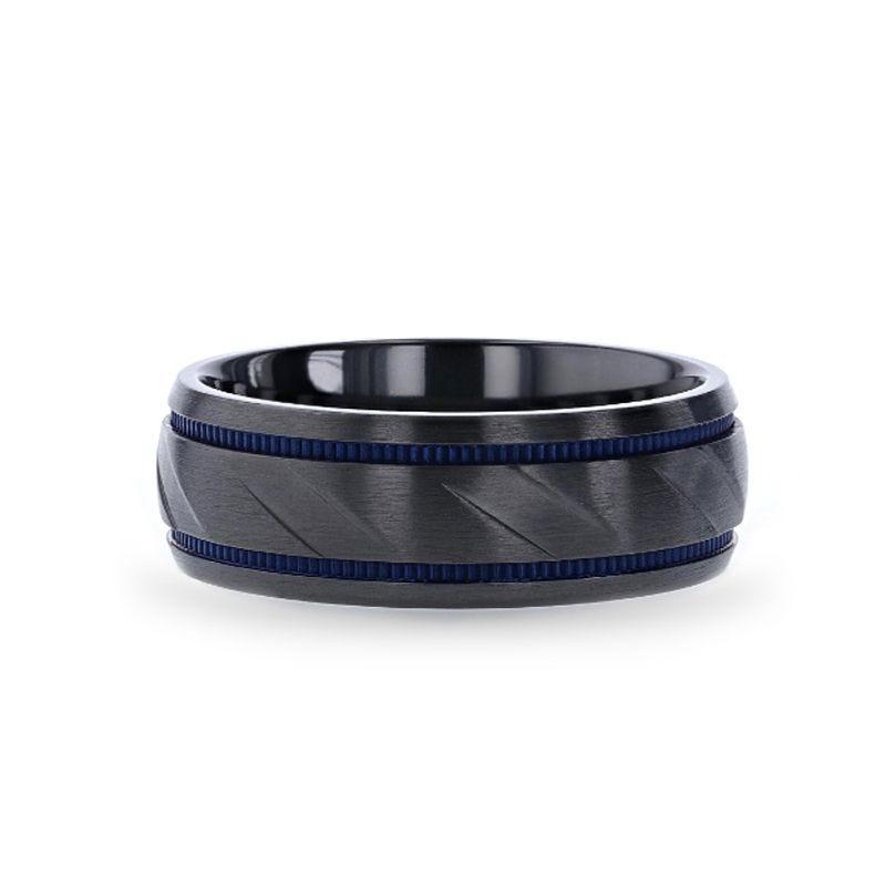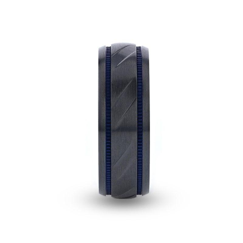 PATROL Black Titanium Carved Diagonal Pattern Brushed Finish Men’s Wedding Ring with Blue Milgrain Grooves – 8mm