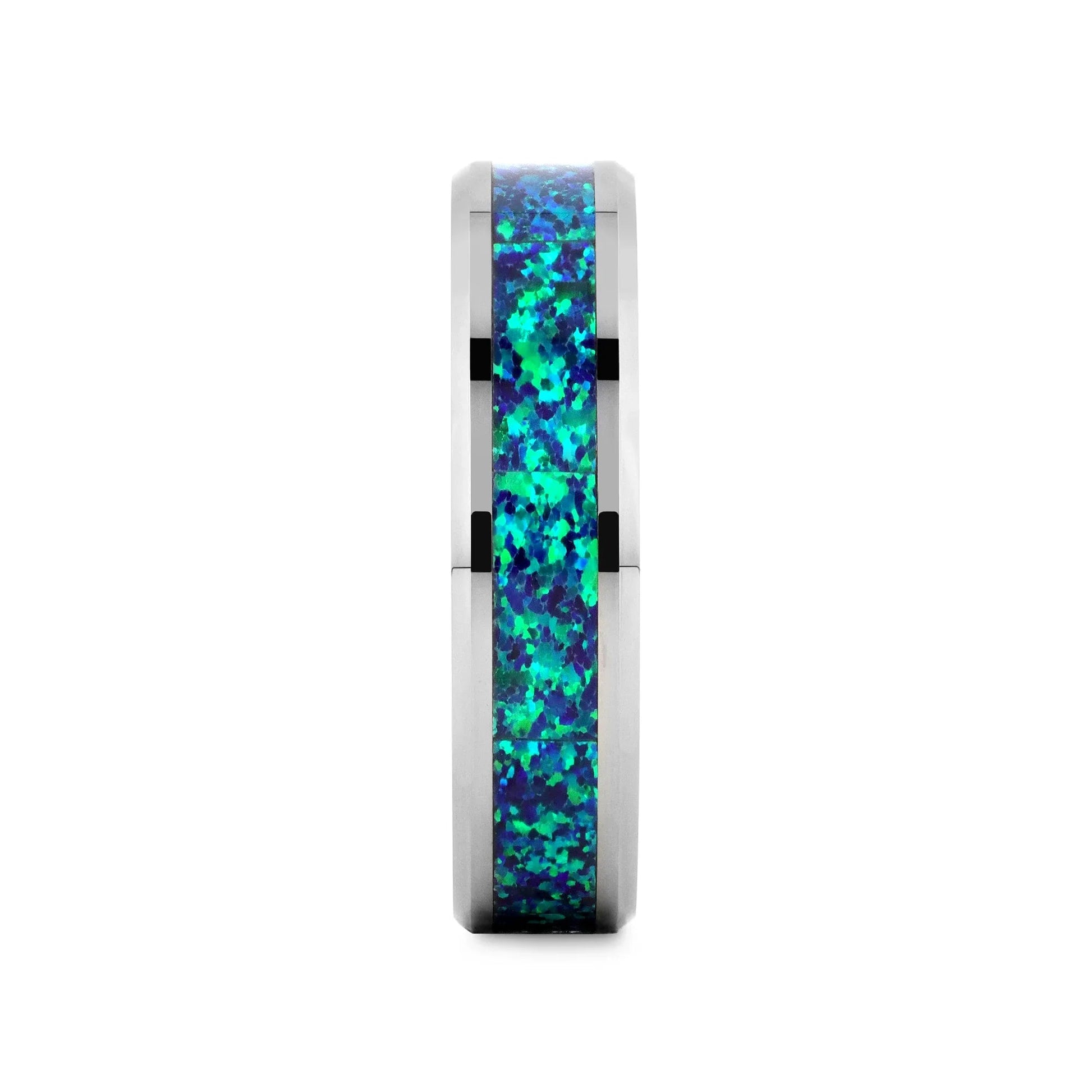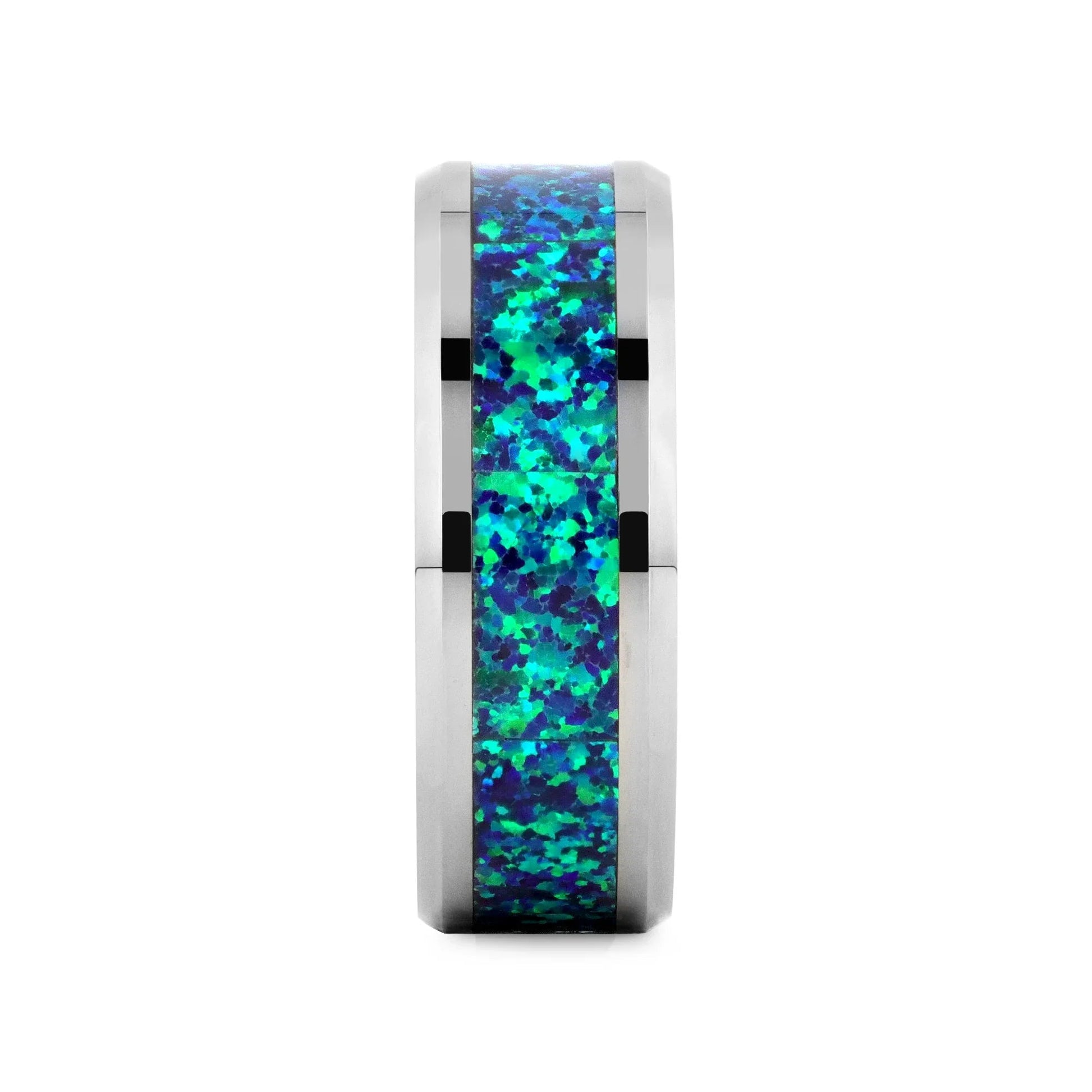 With an inlay of sparkling and dreamy emerald green and sapphire blue Opal, this mesmerizing Tungsten Carbide ring by Thorsten with polished bevel edges is sure to impress anyone who sees it and desires to see it again...and again.