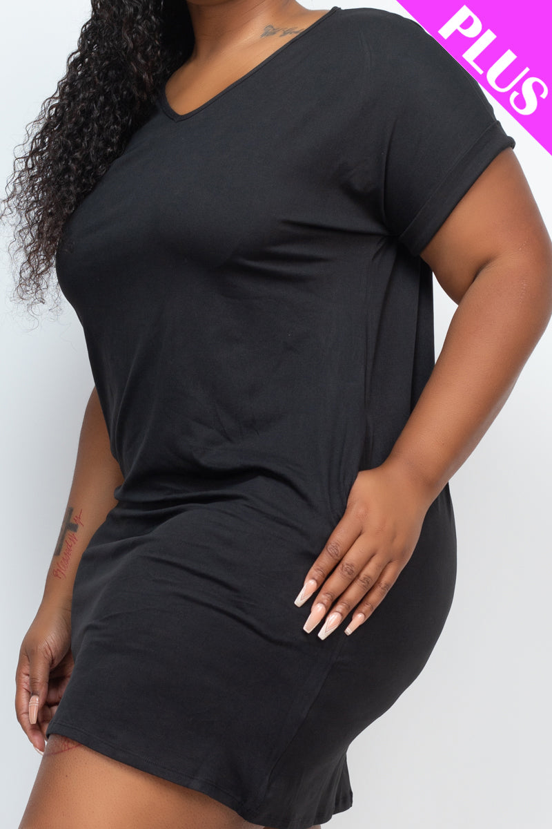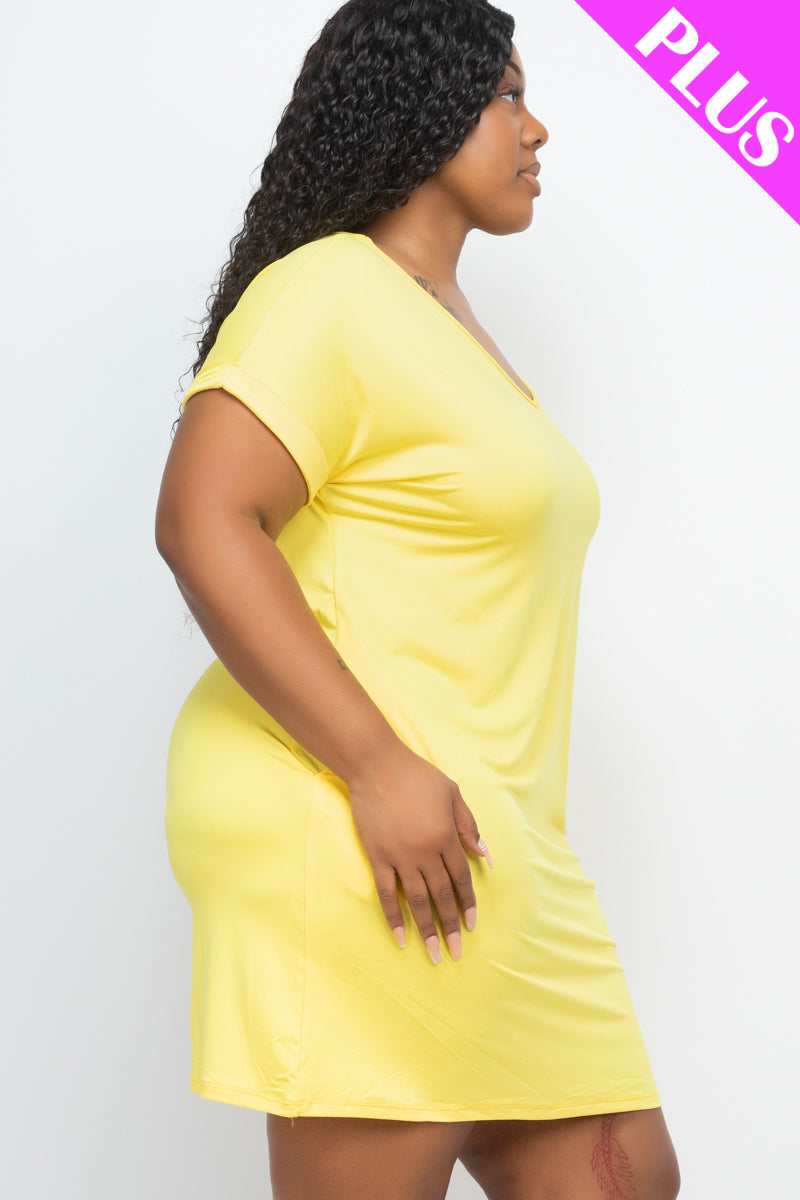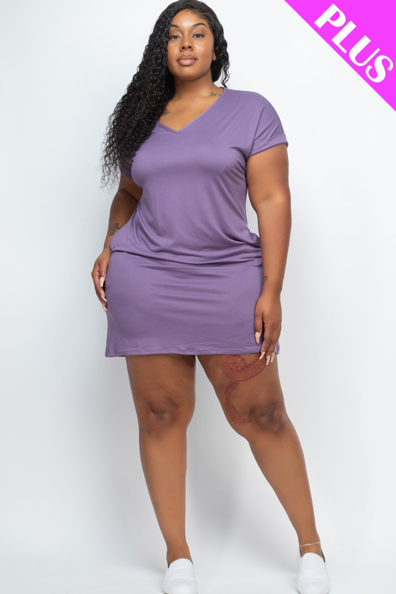 Stay effortlessly stylish and comfortable with this plus-size cap sleeve pocket mini dress. Designed with a relaxed fit, this dress is made from a soft, breathable fabric that drapes beautifully, ensuring all-day comfort. The V-neckline adds a feminine touch, while the rolled cap sleeves create a laid-back, casual look. Functional side pockets add convenience, making this dress perfect for running errands, lounging, or dressing up for a day out. Pair it with sneakers for a casual vibe or accessorize with sandals for an elevated yet easygoing style.