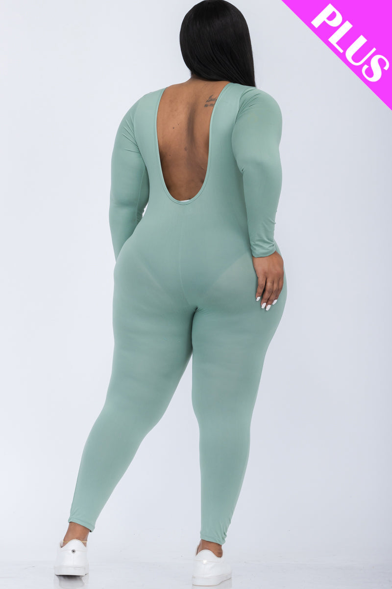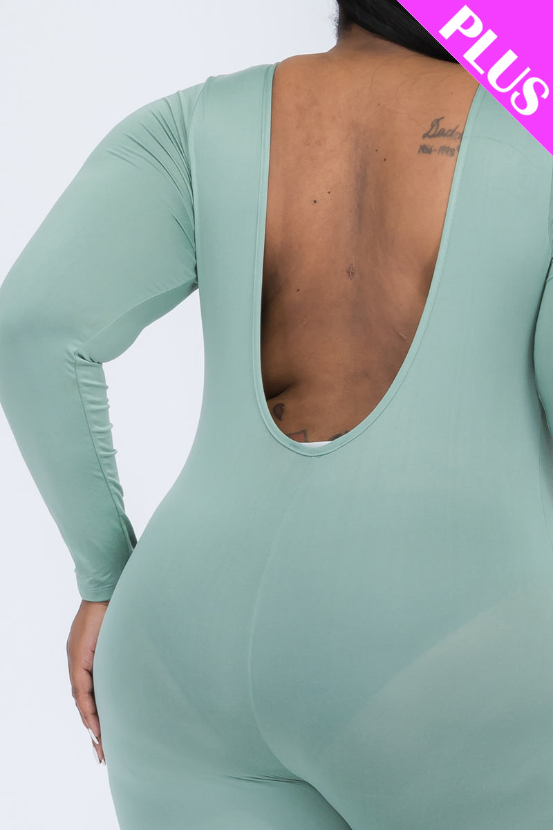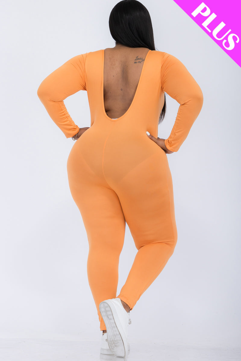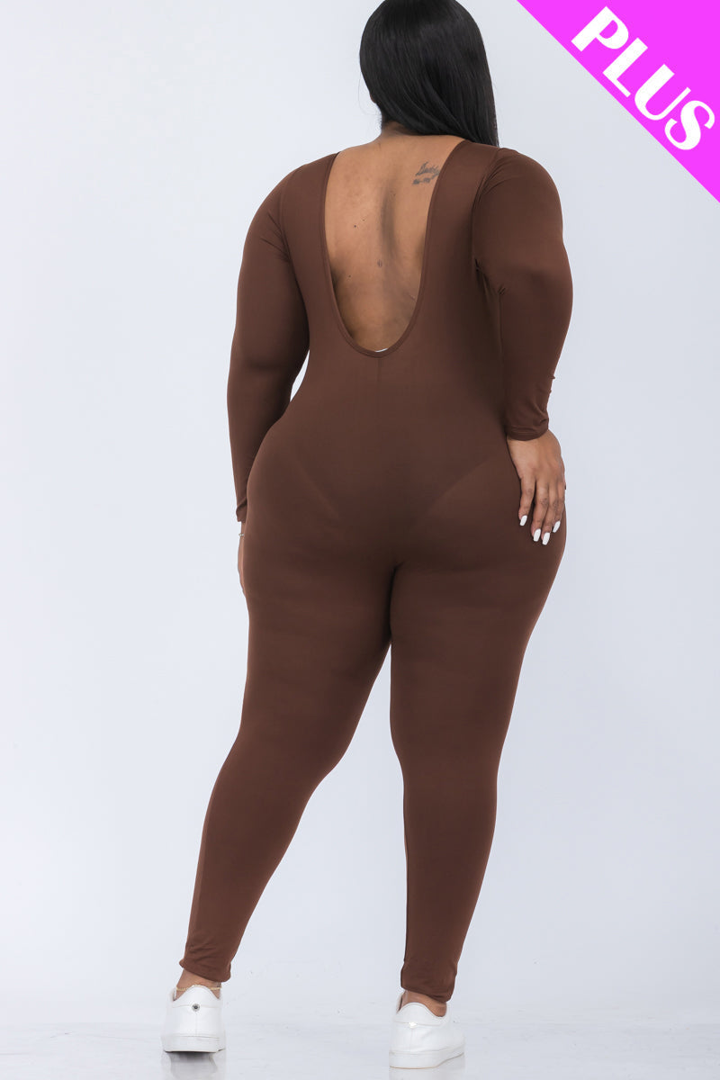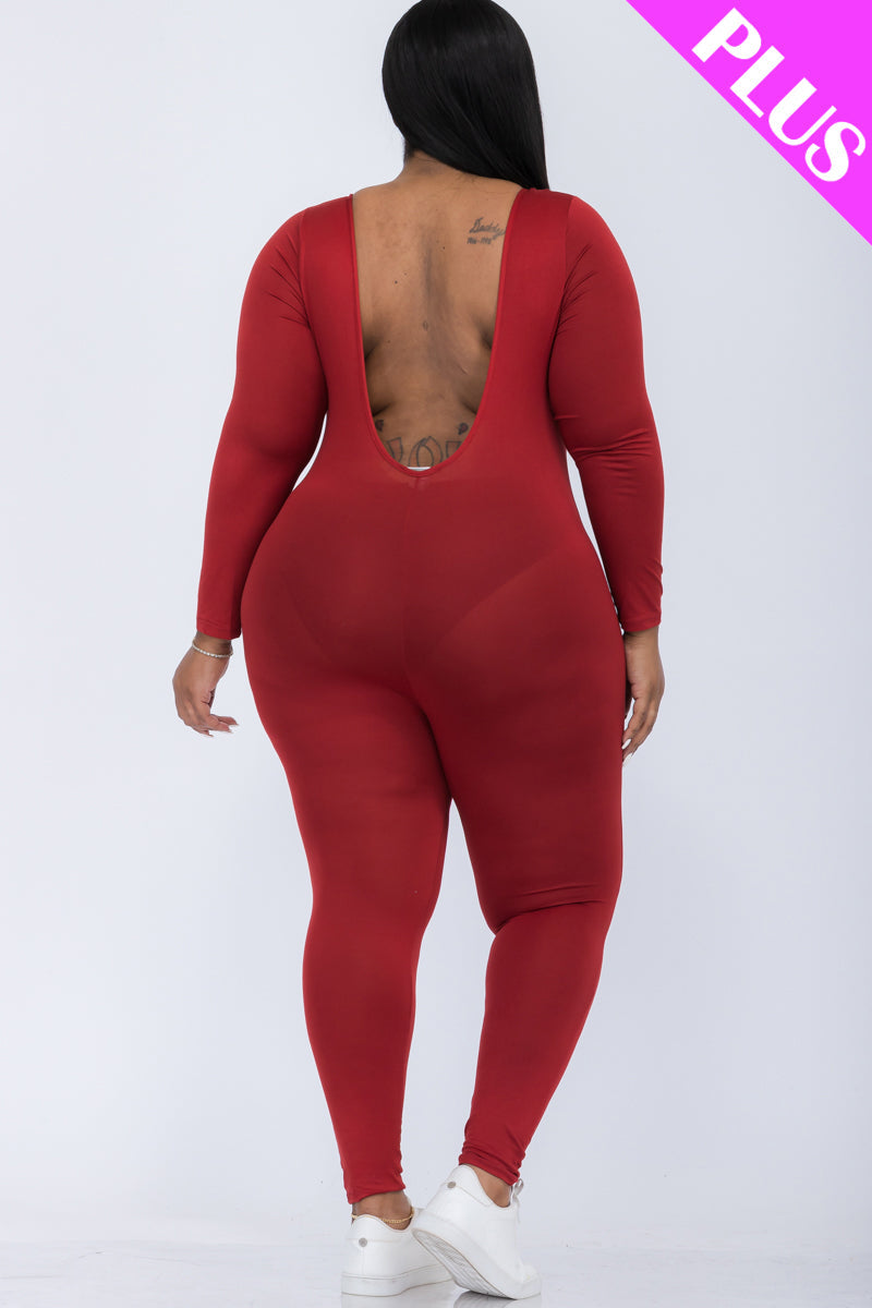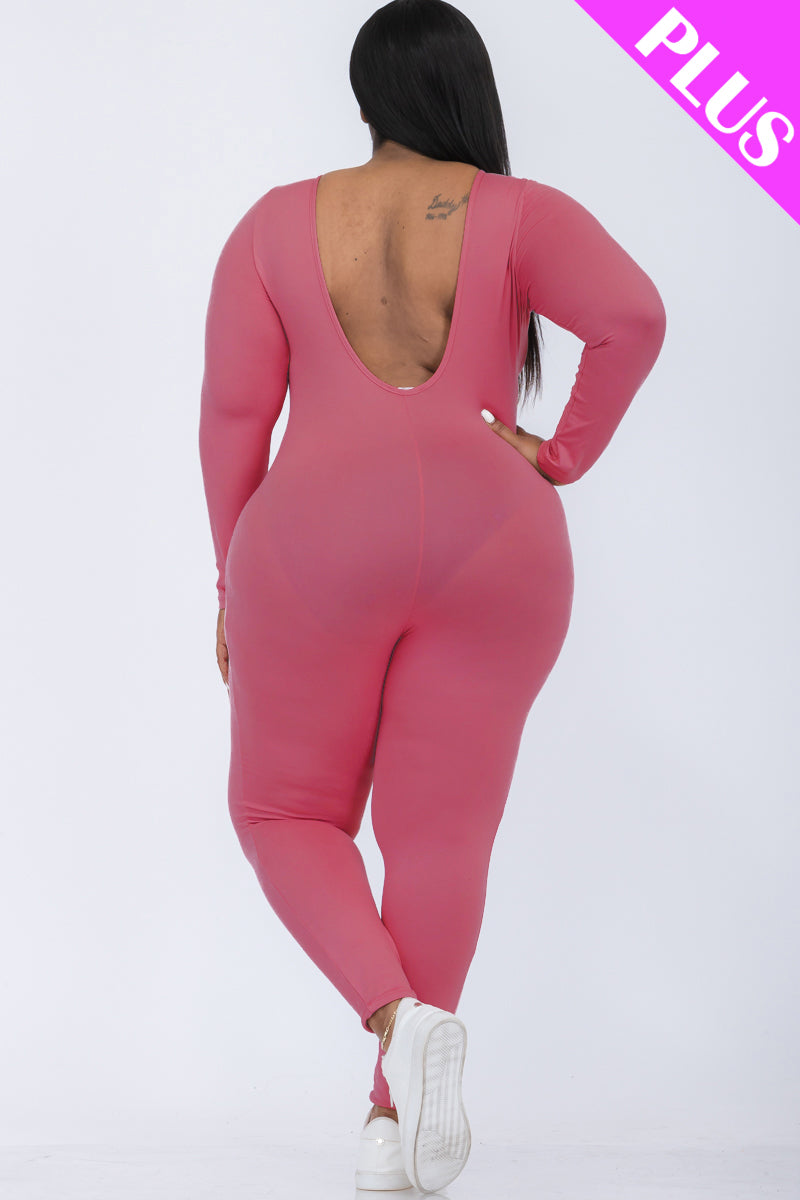 plus size jumpsuit, open-back plus jumpsuit, long sleeve plus-size romper, curve-hugging bodysuit, full-length plus jumpsuit, fitted plus-size outfit, trendy plus-size jumpsuit, sexy plus-size fashion