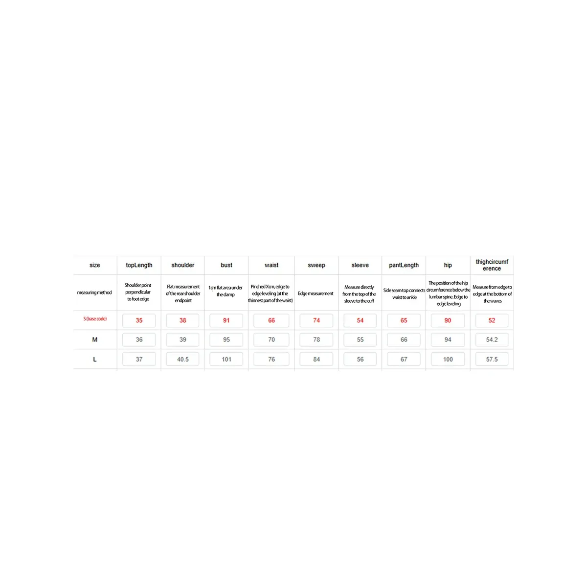 | Size | Top Length (cm) | Sweep (cm) | Pant Length (cm) | Hip (cm) |
