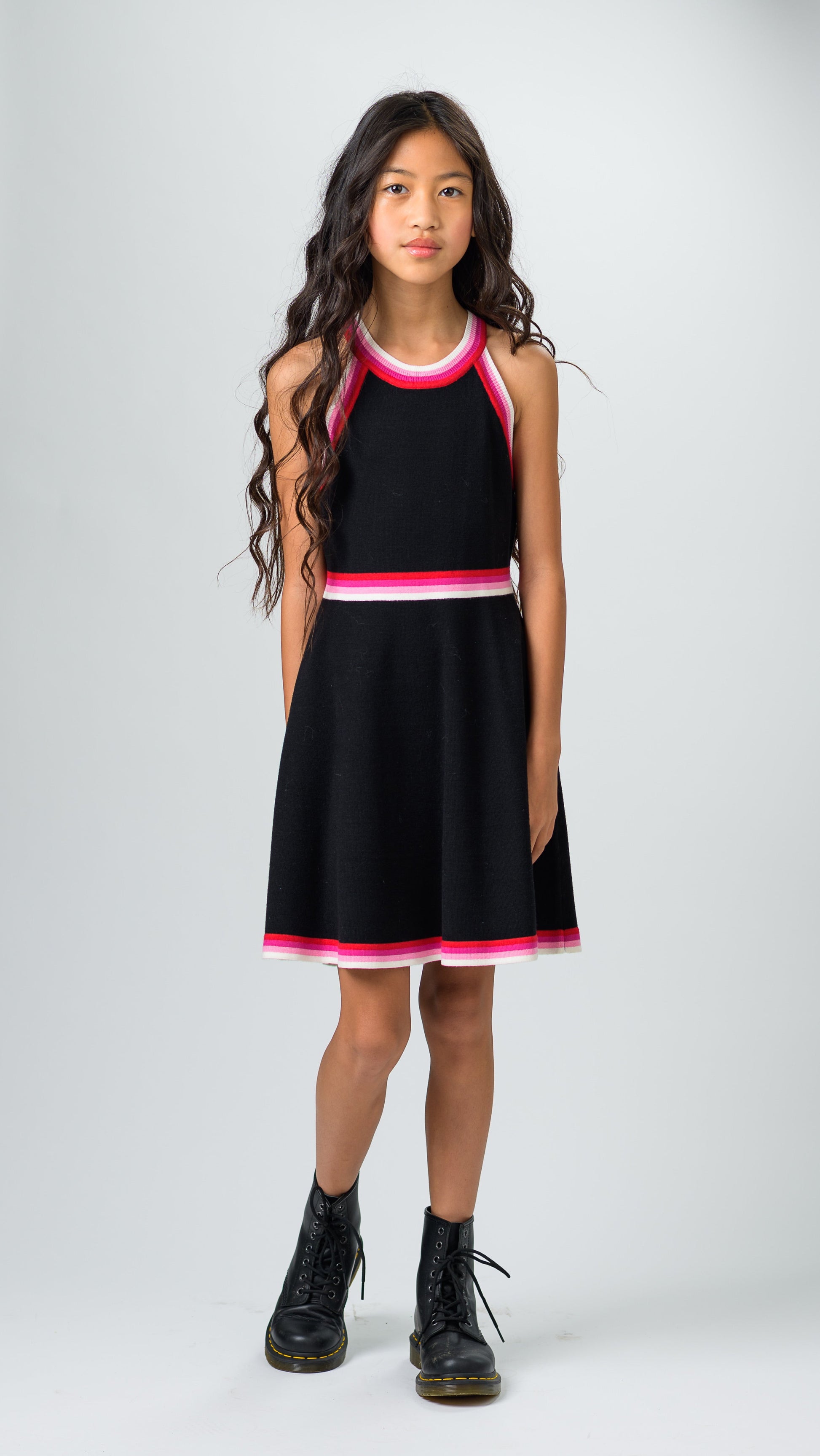 Knit dress with a fit-and-flare silhouette and a contrasting stripe trim.