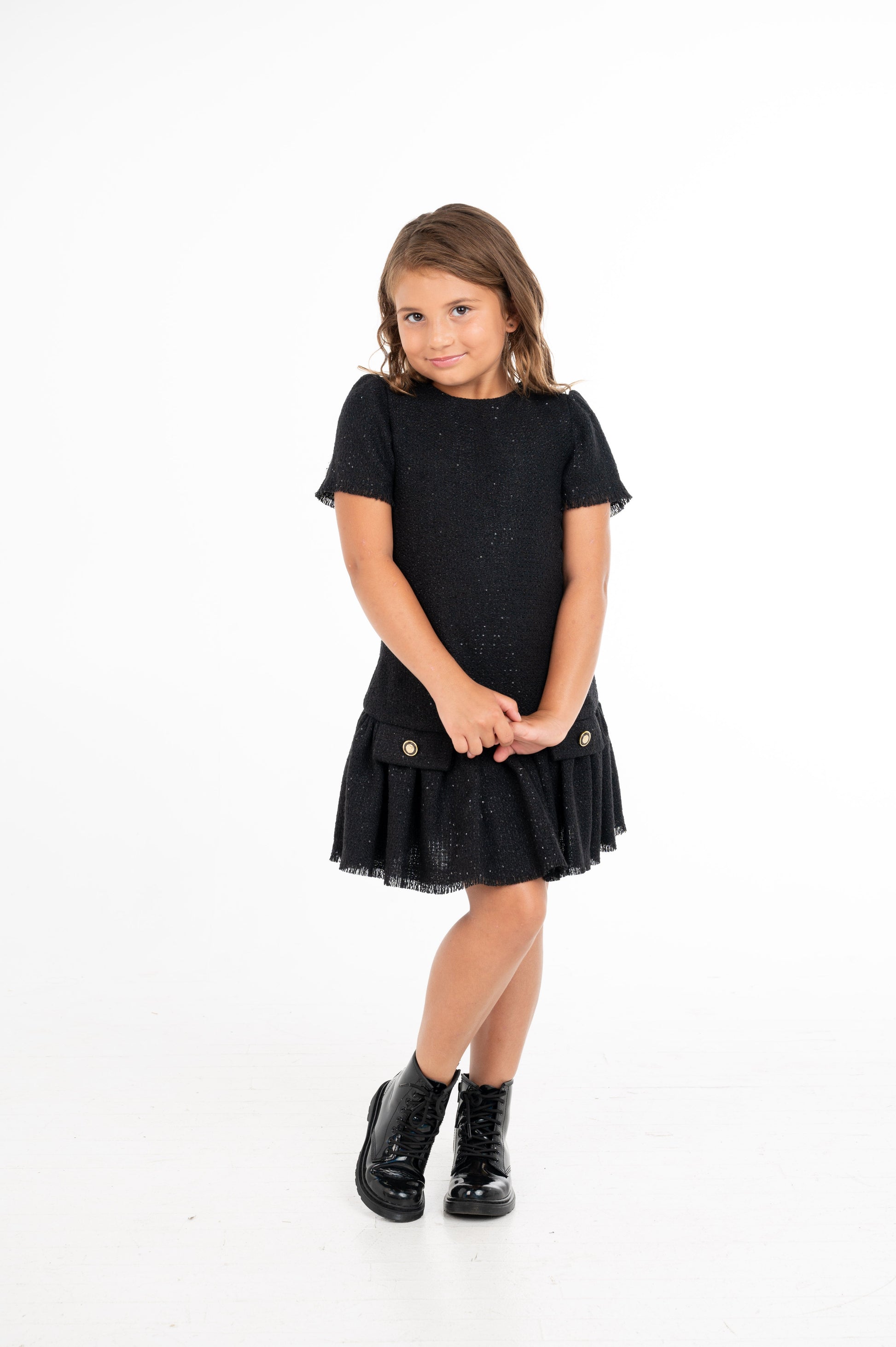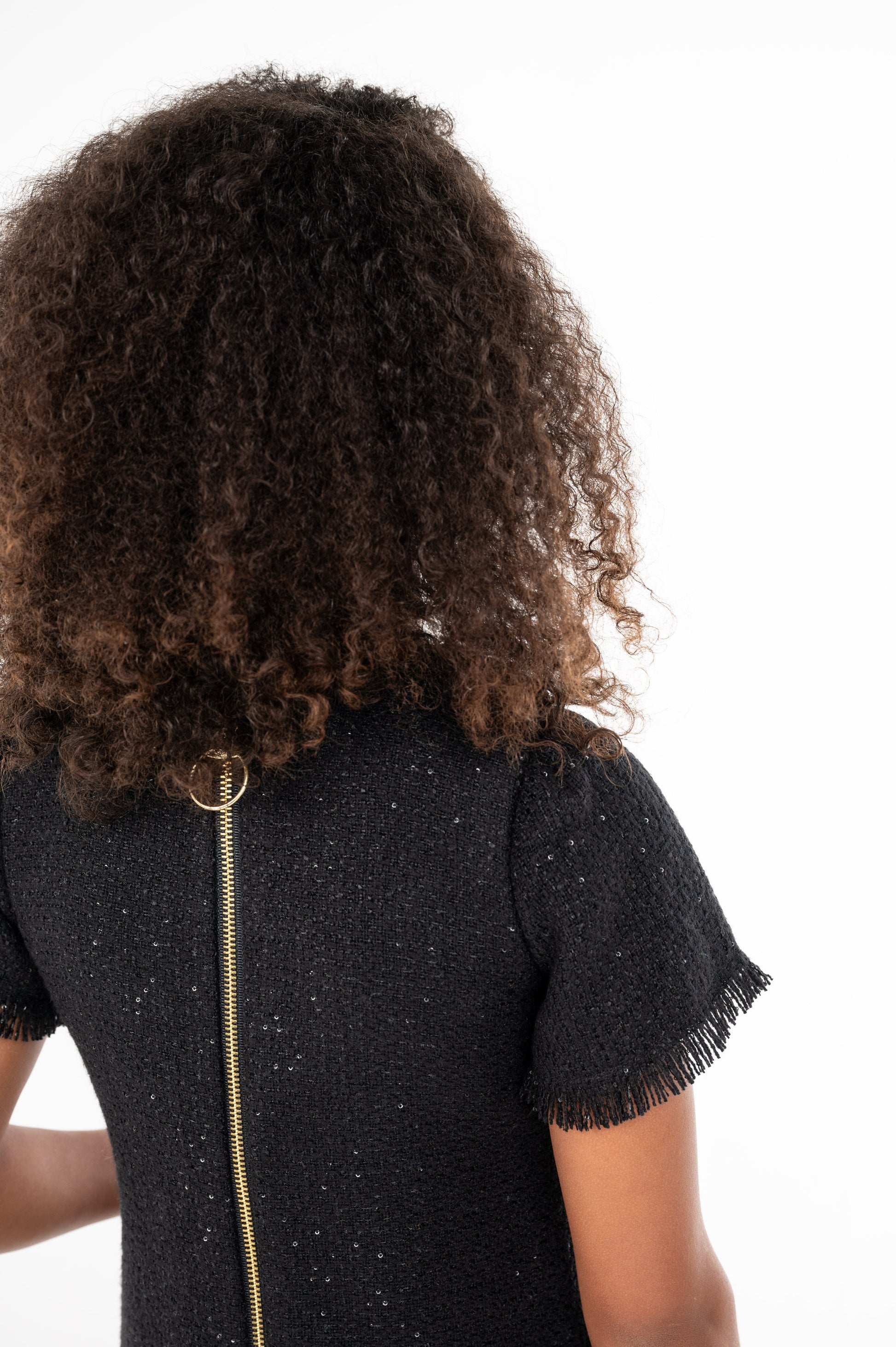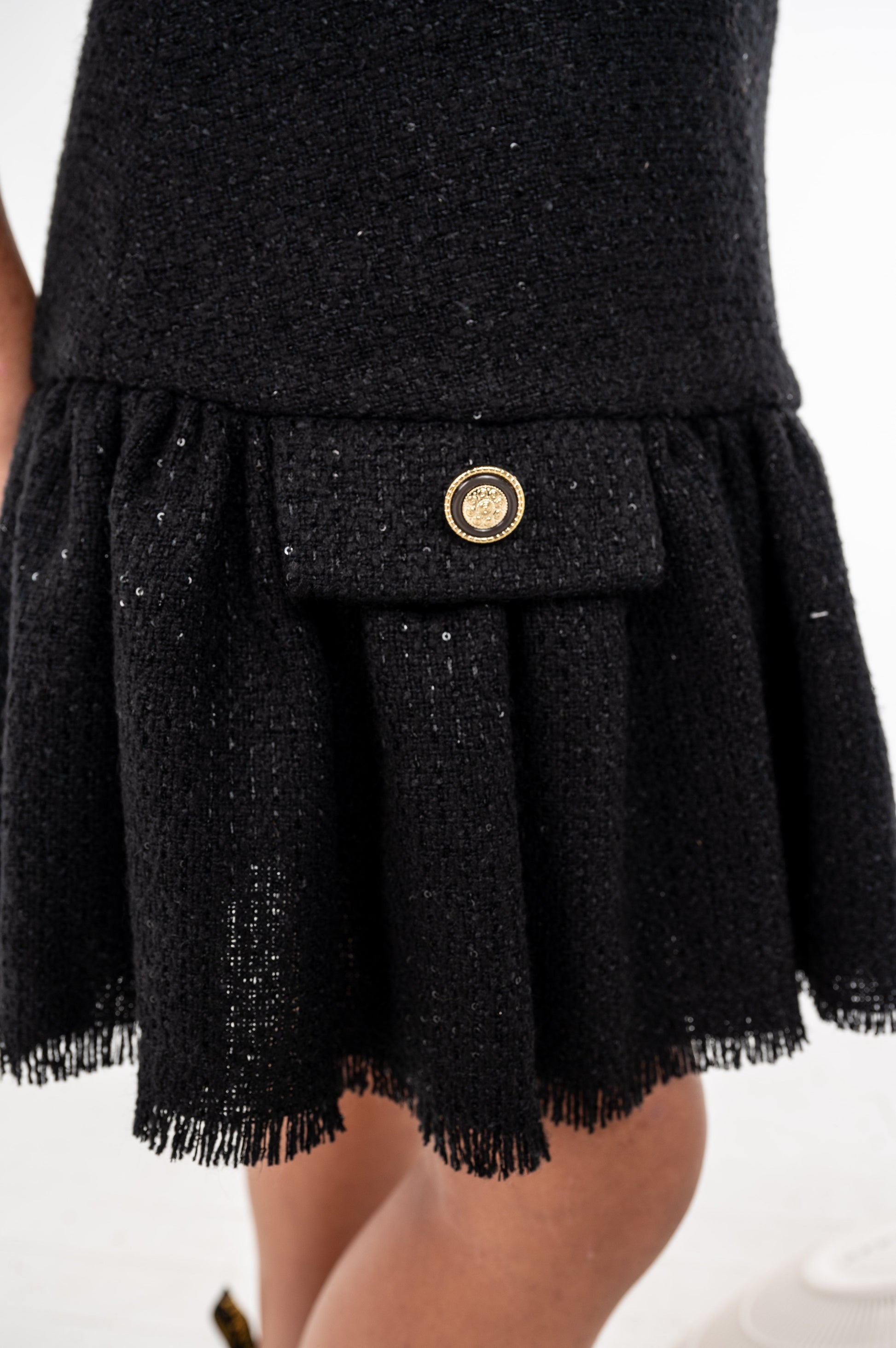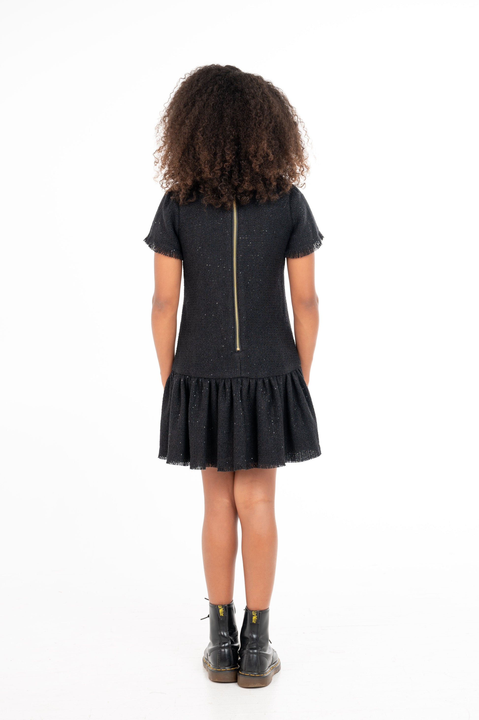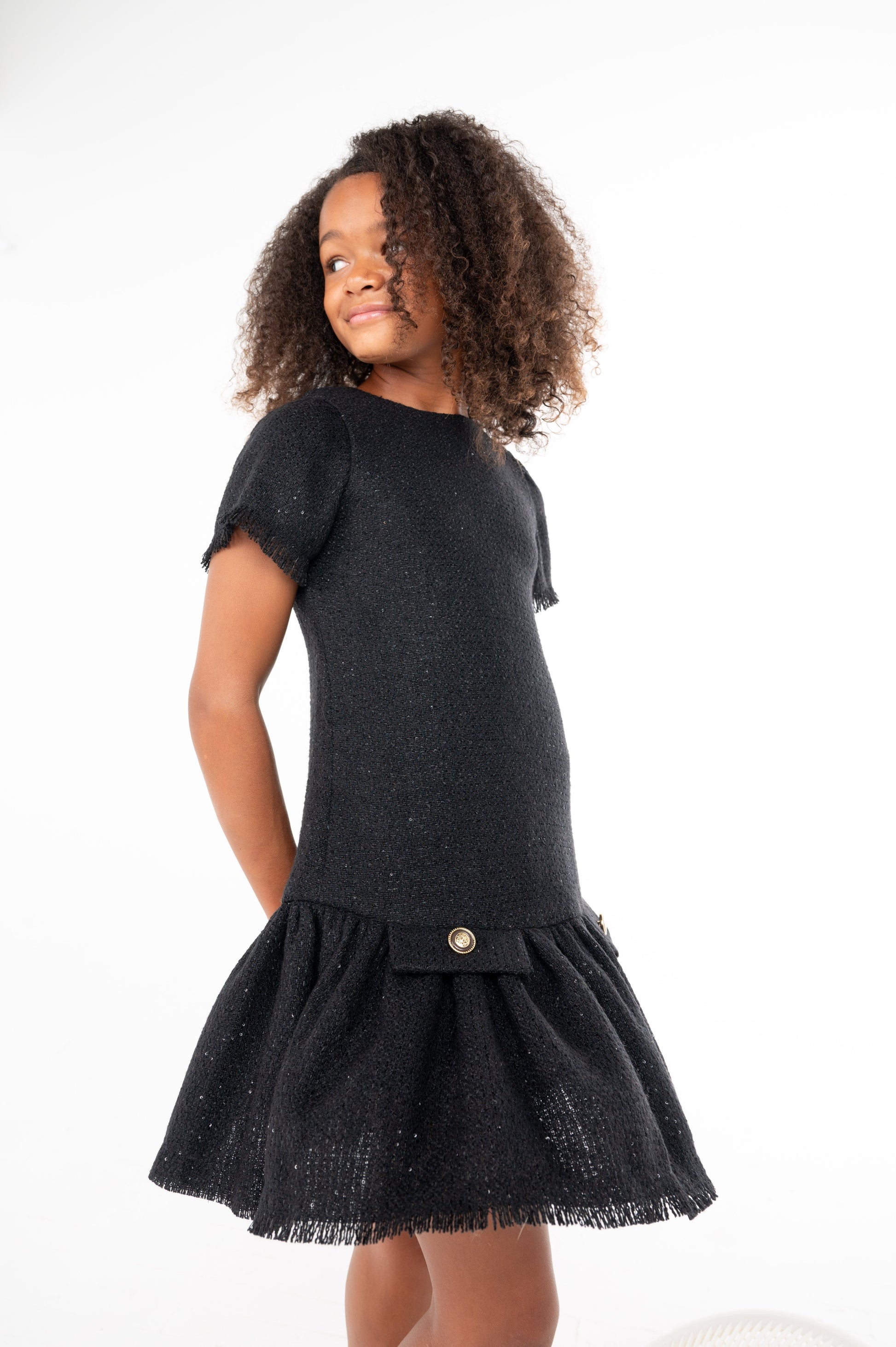- Zoe Renee tweed dress features a frayed hem and button trim