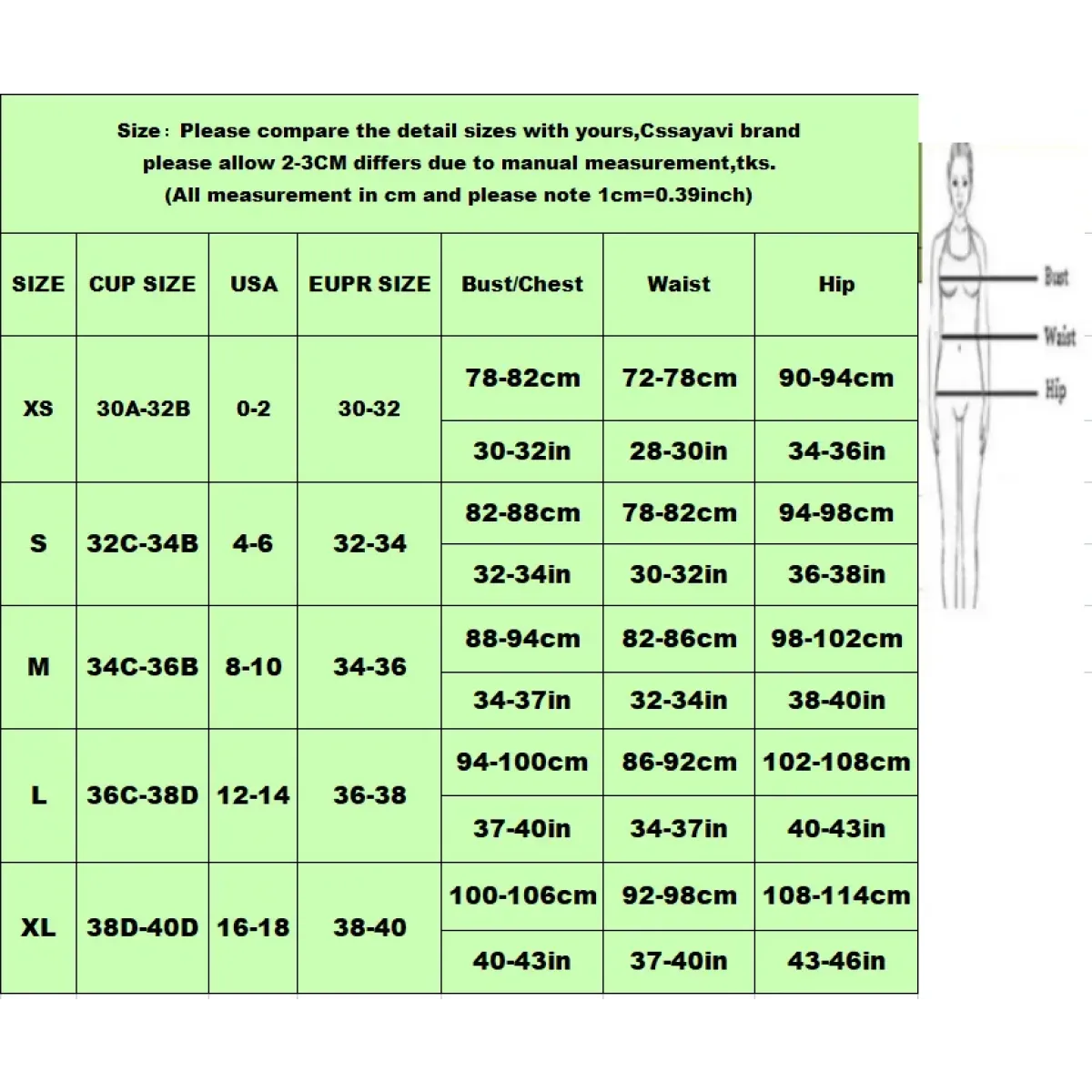 Size | Label | Cup Size | Bust/Chest | Waist | Hip |