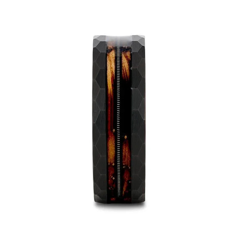 RIFF Black Tungsten Ring with Charred Whiskey Barrel Wood and Guitar String, 8mm