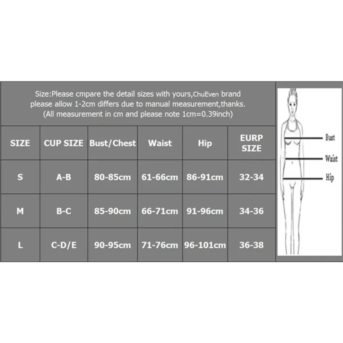 Size | Cup Size | Bust/Chest | Waist | Hip | Size |