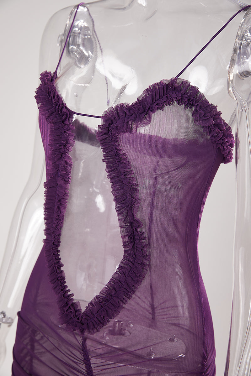 Sexy slight stretch solid color see-through mesh sling slit maxi dress