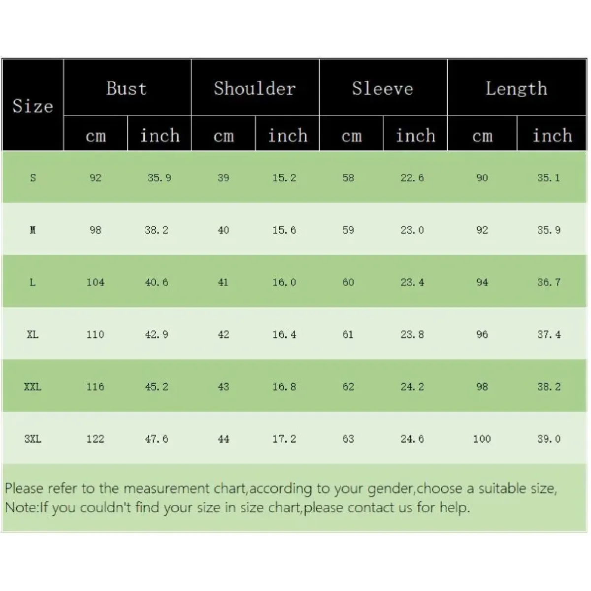 Size | Bust (cm/inch) | Shoulder (cm/inch) | Sleeve (cm/inch) | Length (cm/inch) |