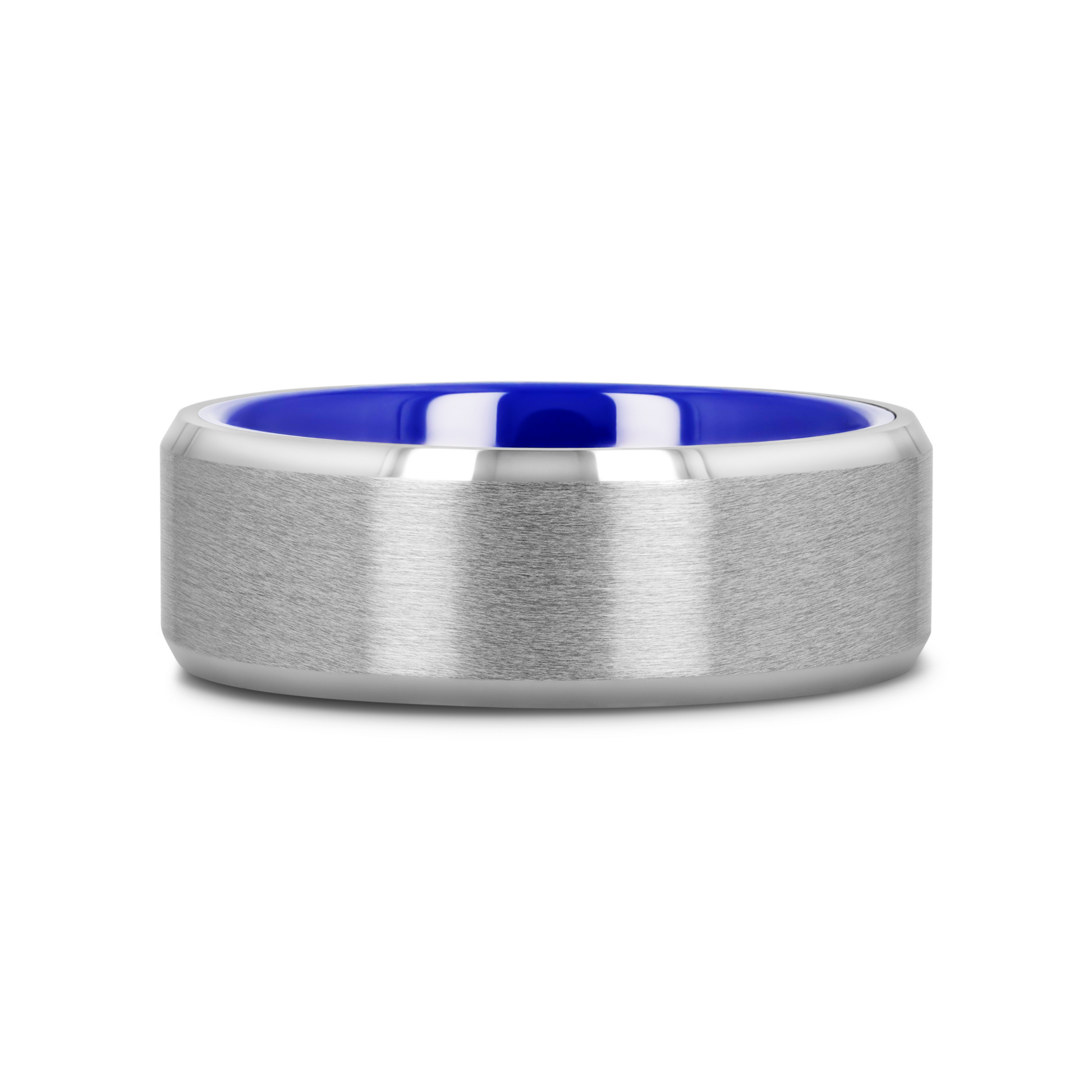 SIRIUS Flat Beveled-Edged Tungsten Ring with Brushed Center and Vibrant Blue Ceramic Inside - 8mm