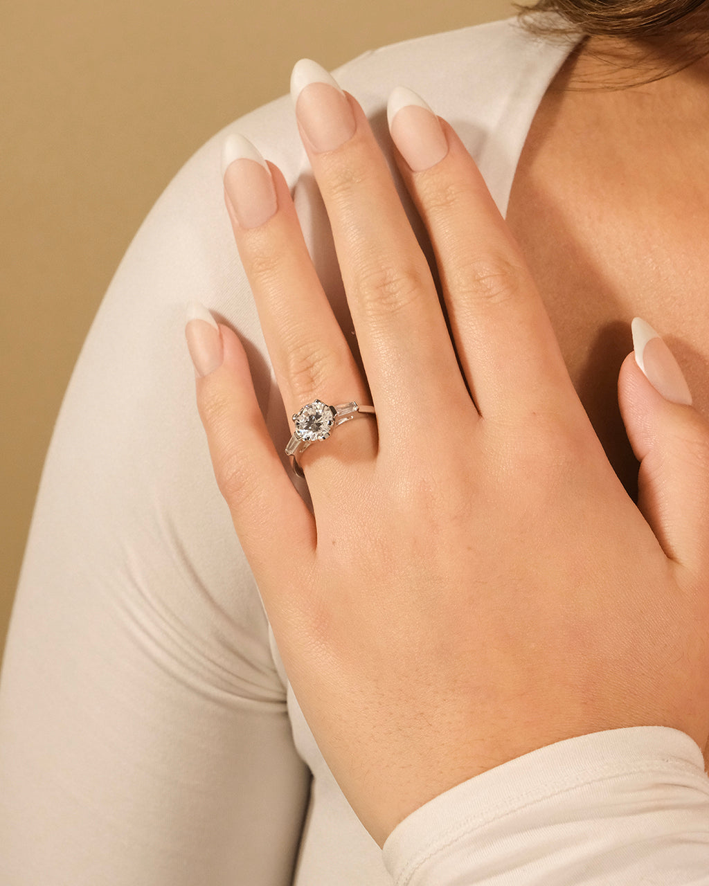 Sterling Silver 4-Prong Brilliant Cut & Baguette Accent Engagement Ring
