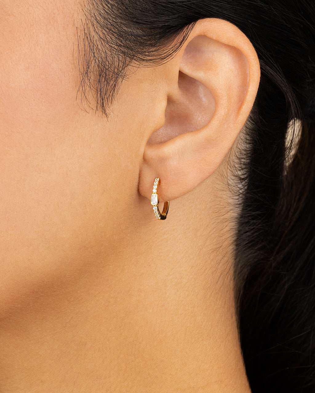 A sleek take on statement sparkle. These huggies pair an emerald-cut bezel centerpiece with a row of round CZs—minimal, but far from boring. Style them solo or stack with micro hoops for a polished ear party.