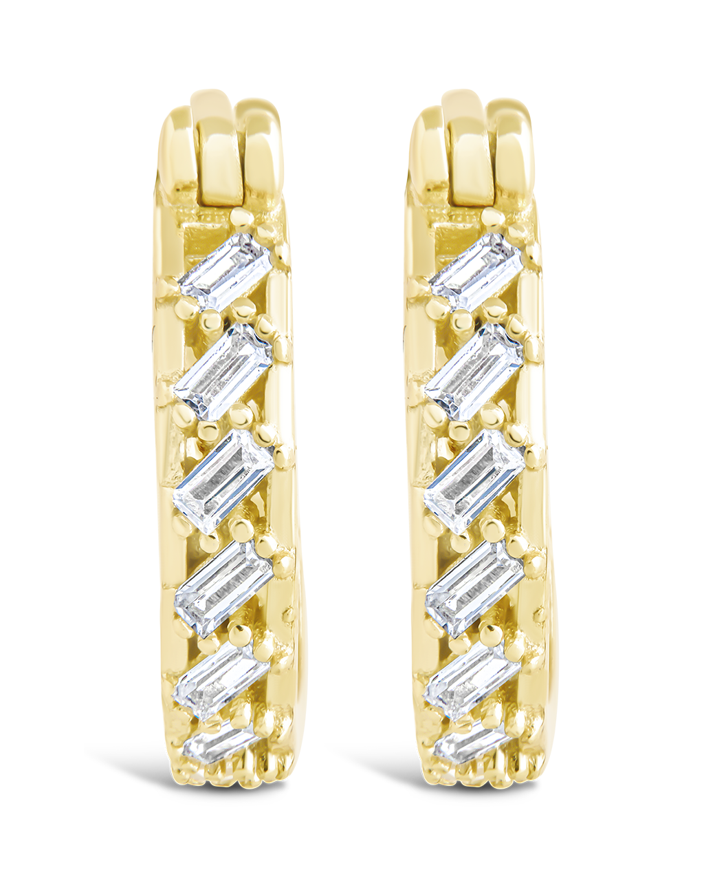 Baguette brilliance, reimagined. These micro hoops feature a luxe row of angled CZs in a crisscross setting—bold, refined, and built to stack or steal the show.