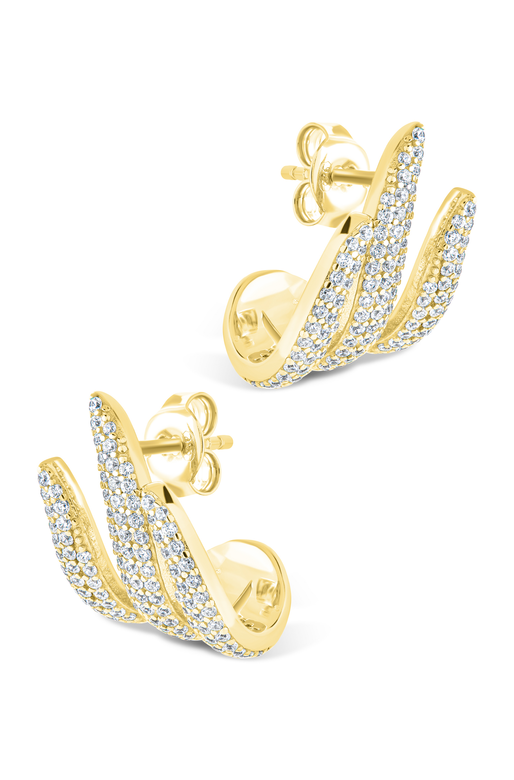 Features: 0.5" by 0.5" huggie hoops with 3 staggered rows pave set embedded cz. post backing. Lead and nickel free