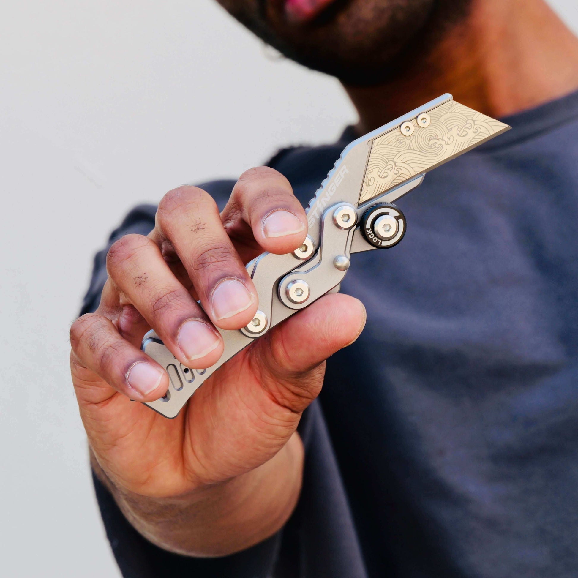 Minimal, functional, and sleek is the definition of the Gozilla Blade. The full opened length is only 6 inches and when closed, it stands at less than 4.5 inches in length and less than 0.75 inches in thickness. The miniature size of the box cutter means it can easily be hidden in any coin pocket, wallet, or attached to a set of keys. Weight: The ultralight weight of the Gozilla Blade is 2.3 oz.