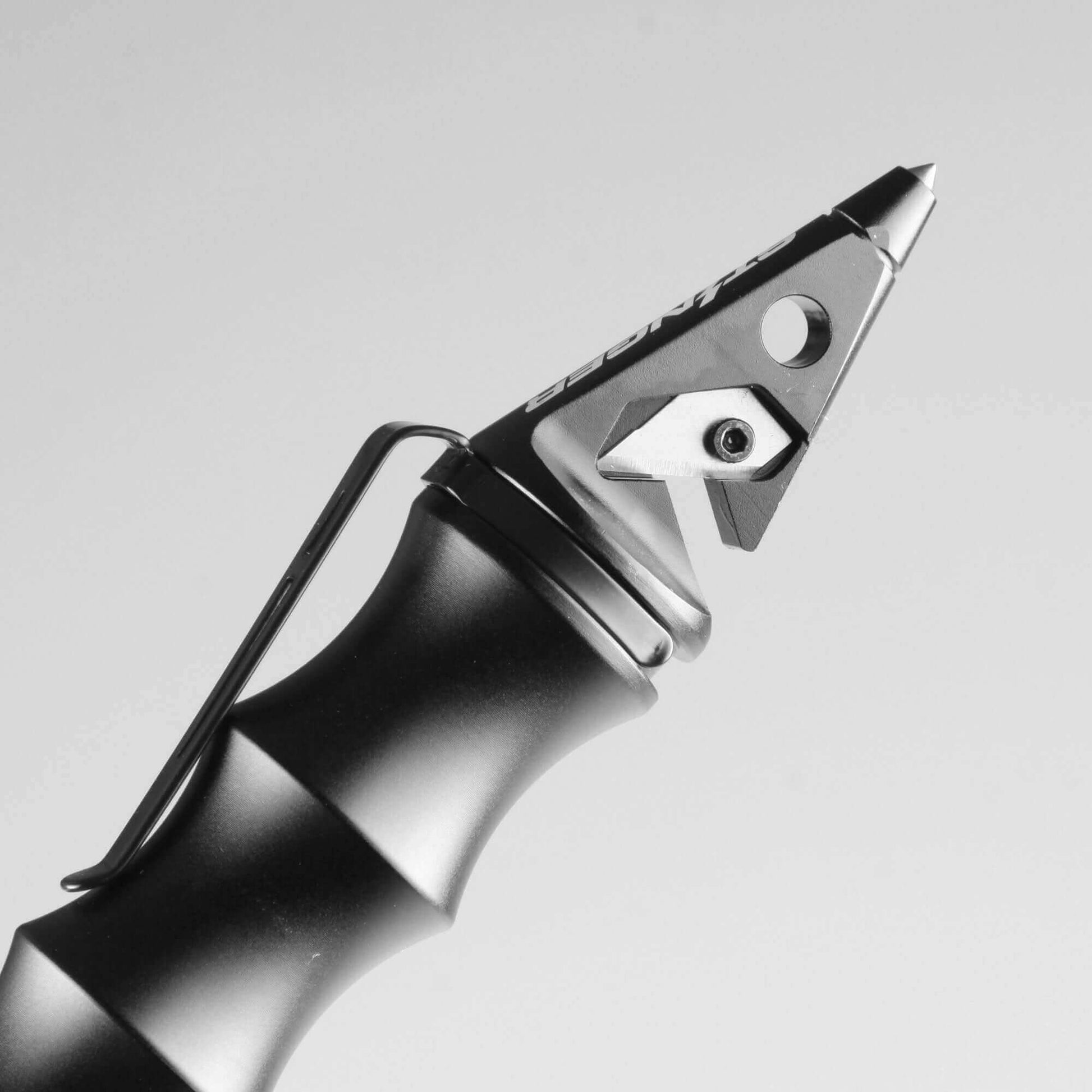 - The hardened steel tip on the handle is a window breaker designed to shatter tempered glass if a vehicle is entrapped.