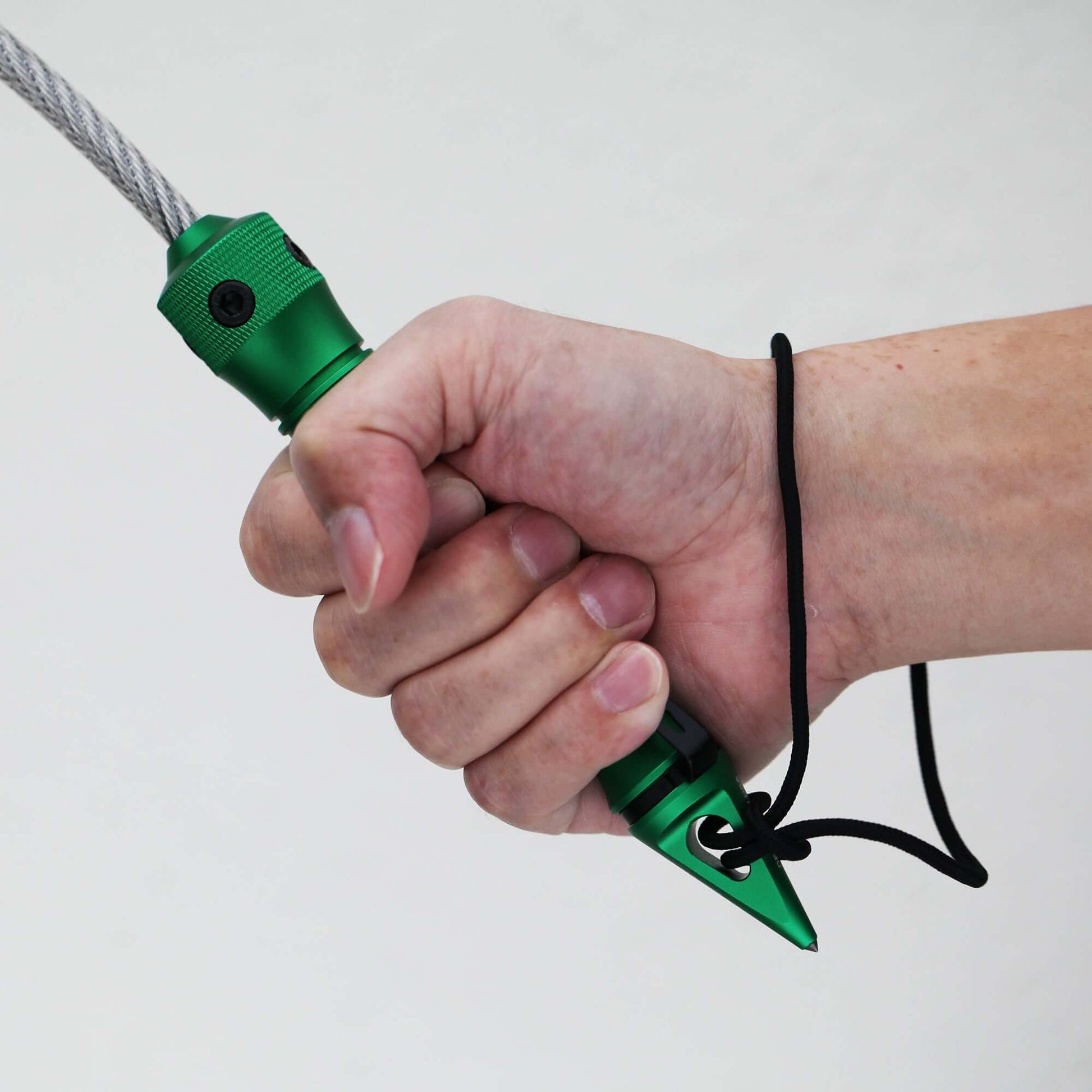 - The hardened steel tip on the handle is a window breaker designed to shatter tempered glass if a vehicle is entrapped.