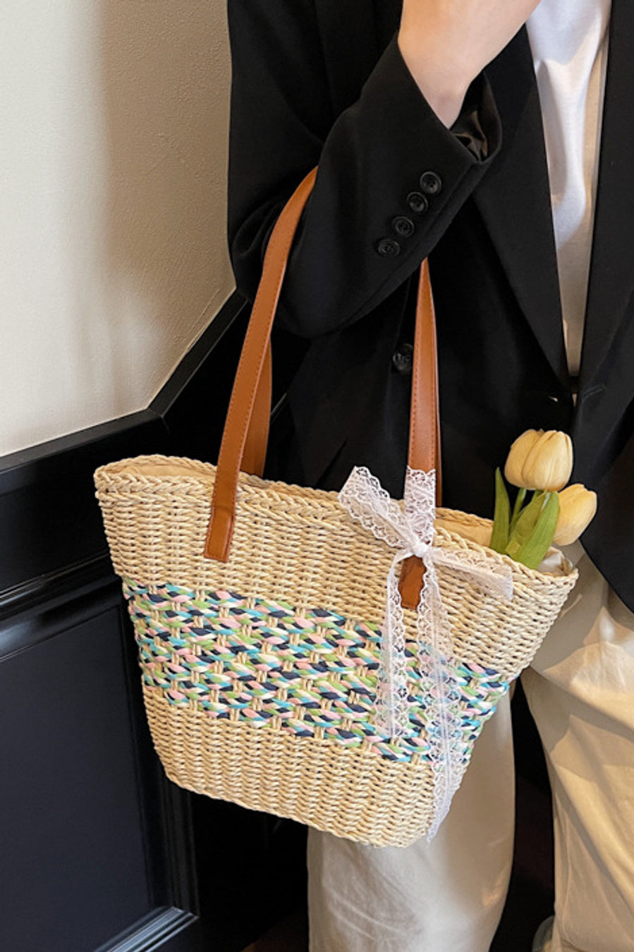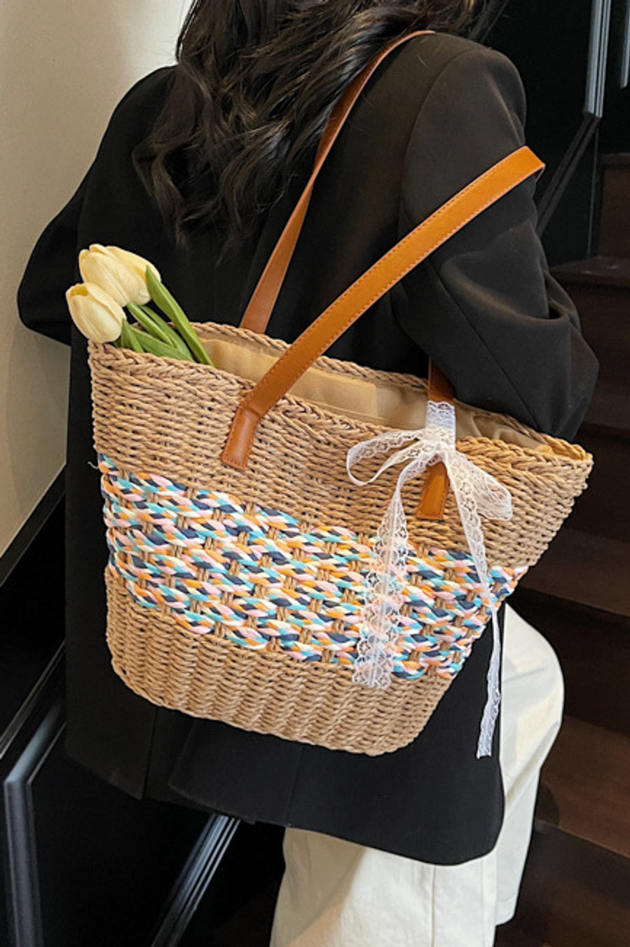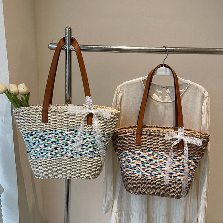 Stylish new contrast color weave beach straw zip-up shoulder bag