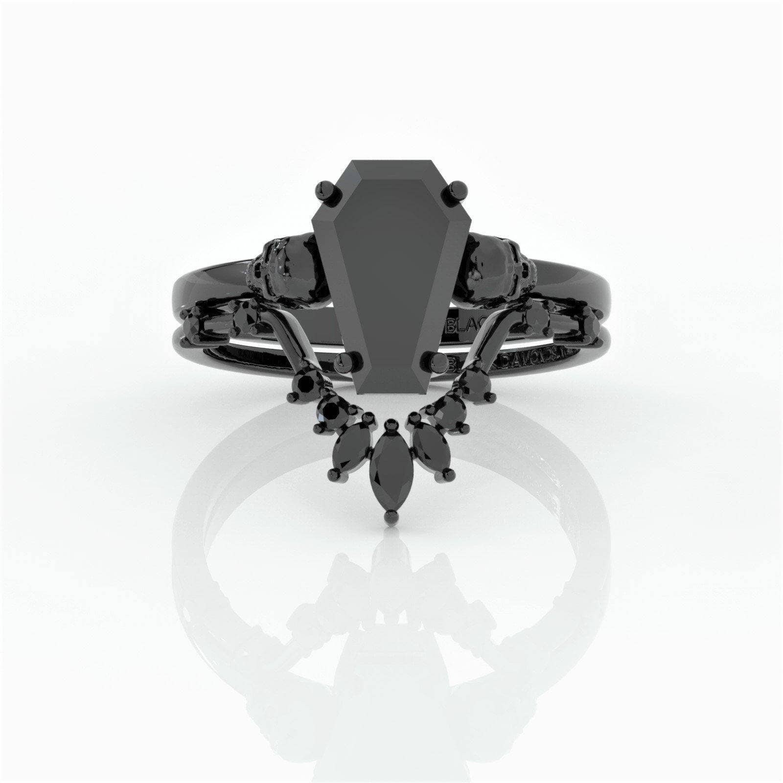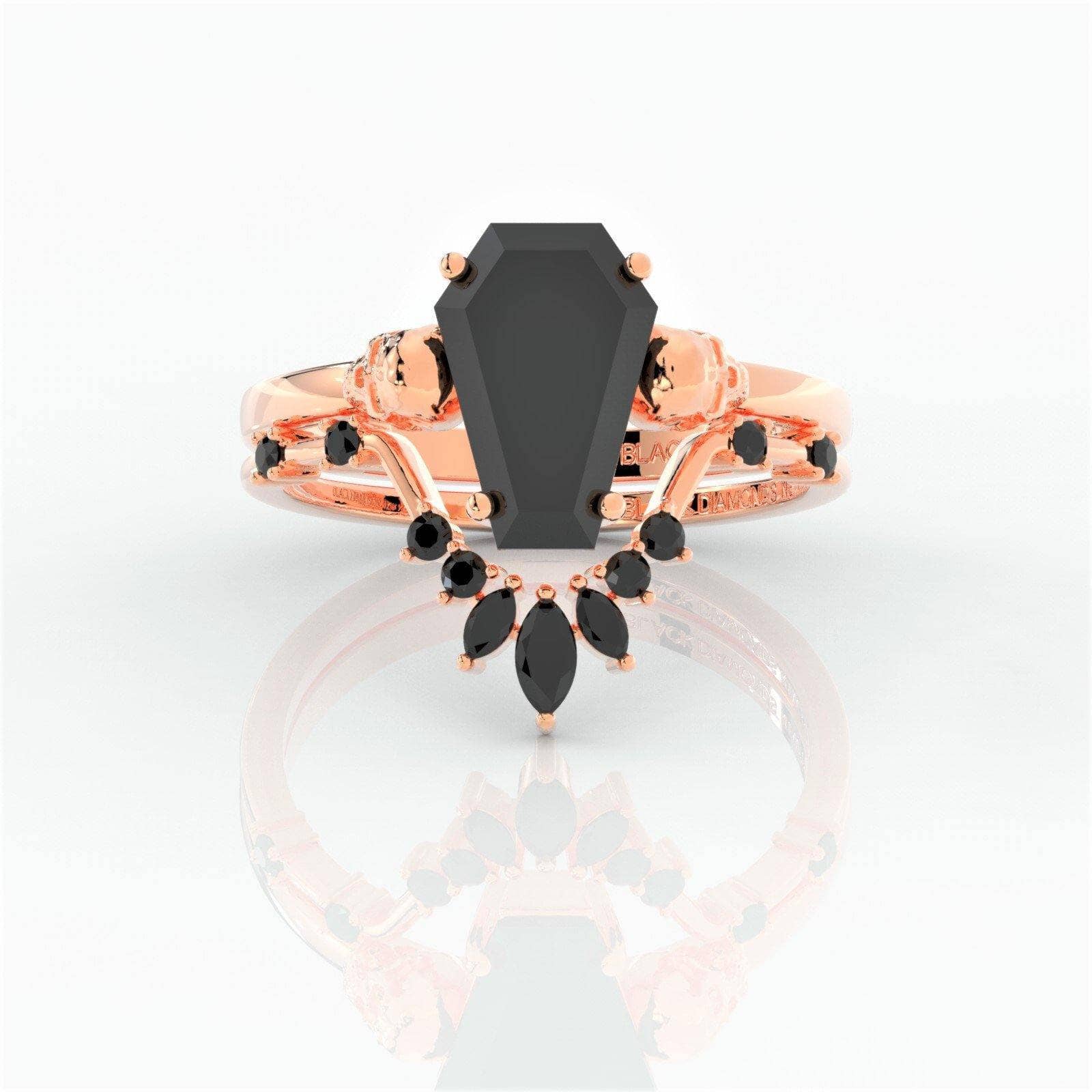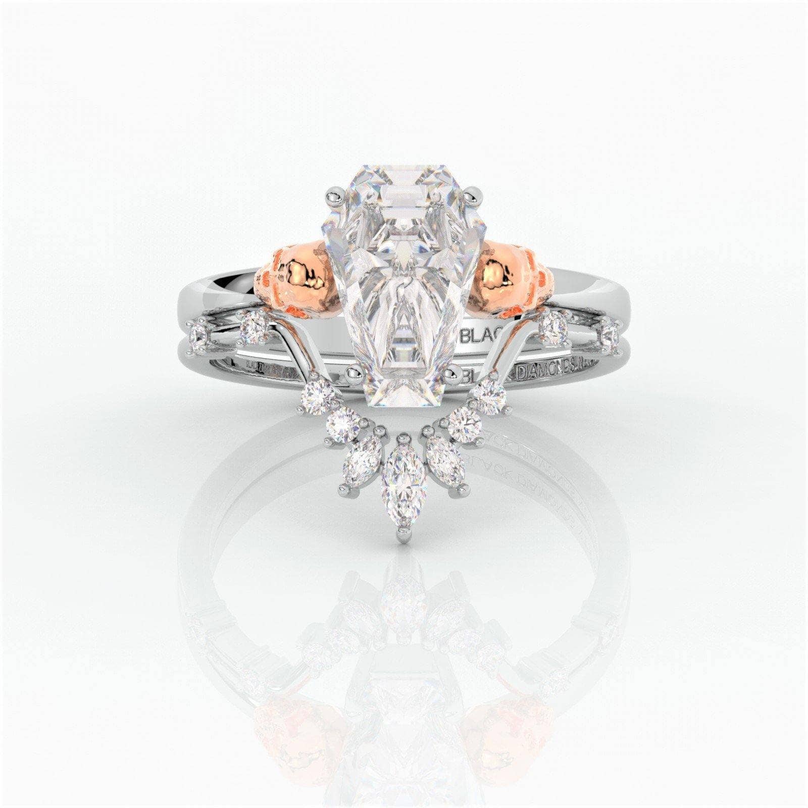 A love that defied the ages, their promise was sealed not in sunlight, but in the moon's ethereal glow. Our "True Love" rings, crafted in luminous 14K white gold, tell this timeless story. An unconventional love deserves an unconventional symbol, which is why a striking coffin-cut diamond takes center stage, a testament to a bond that is eternal. The intricate design features two black skulls, eternal guardians of their sacred vow, while a crown of smaller diamonds completes the set, whispering of a love that is both precious and haunting. This is more than a ring; it's an emblem of a love that is true, profound, and everlasting.