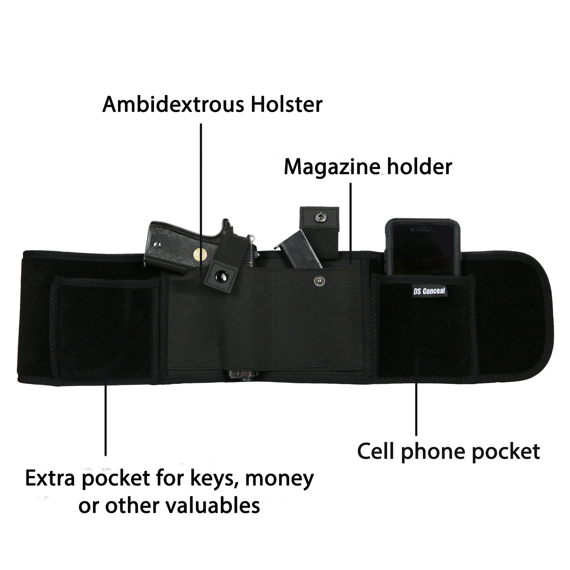 Standard holsters need belts, limiting wardrobe choices. Neoprene on the other hand is soft against your skin which is why it is used in knee braces and back braces. The high-quality elastic holster flexes to accommodate most pistols, including full-size 1911s. Leave your wallet or purse at home. This belly band comes with a spare magazine pocket and two additional pockets that conveniently hold a cell phone, money, credit card, keys etc. Carry bag included for easy transport and storage.