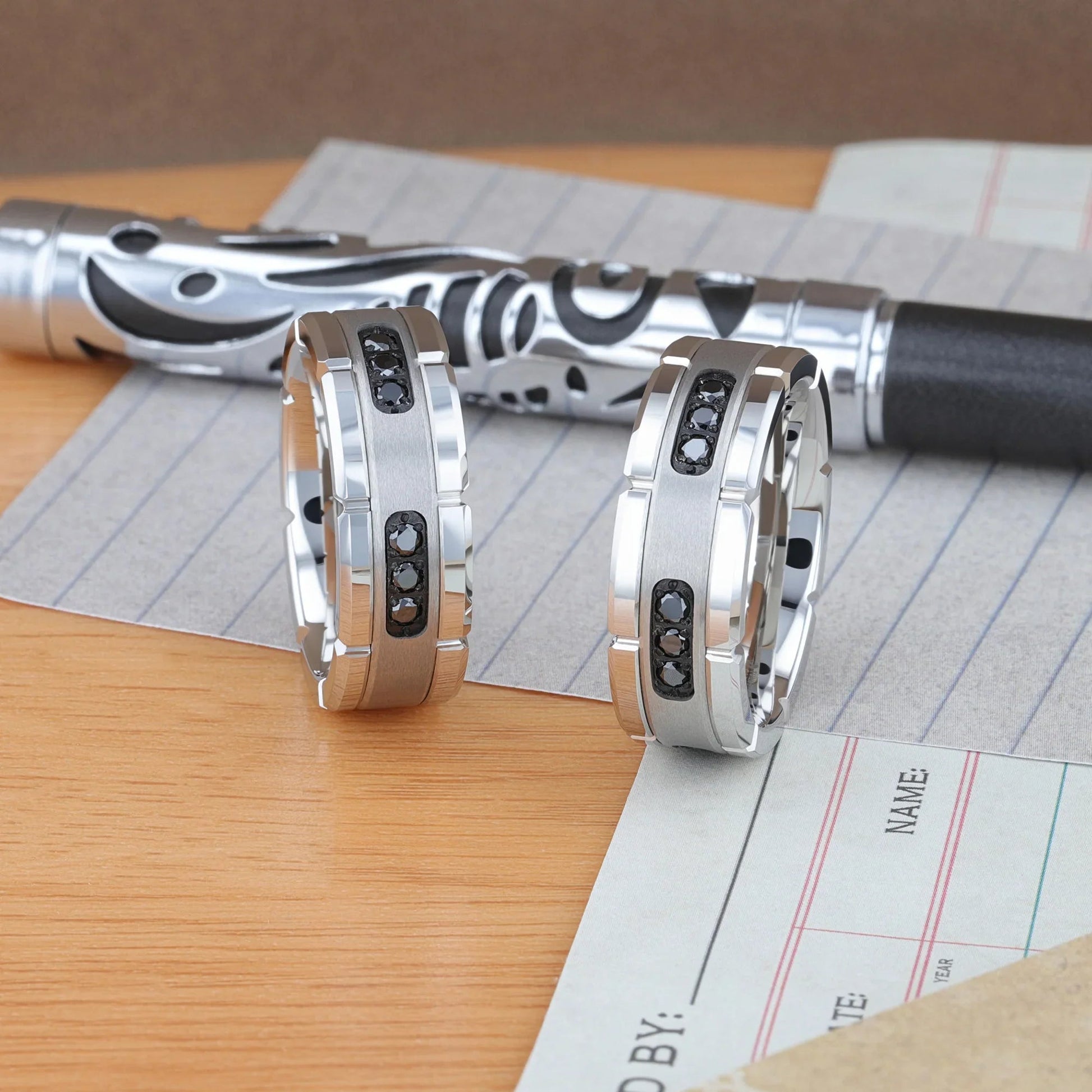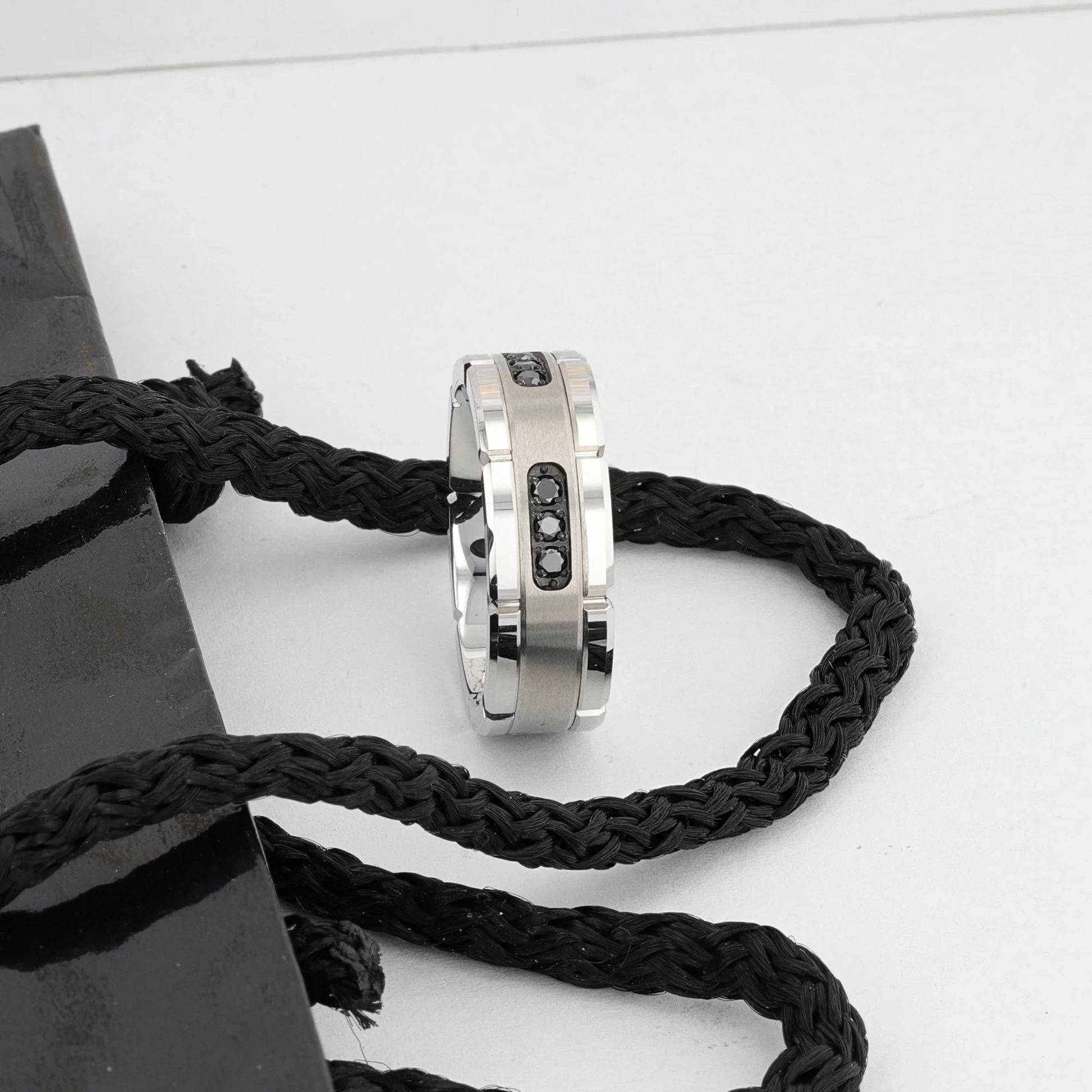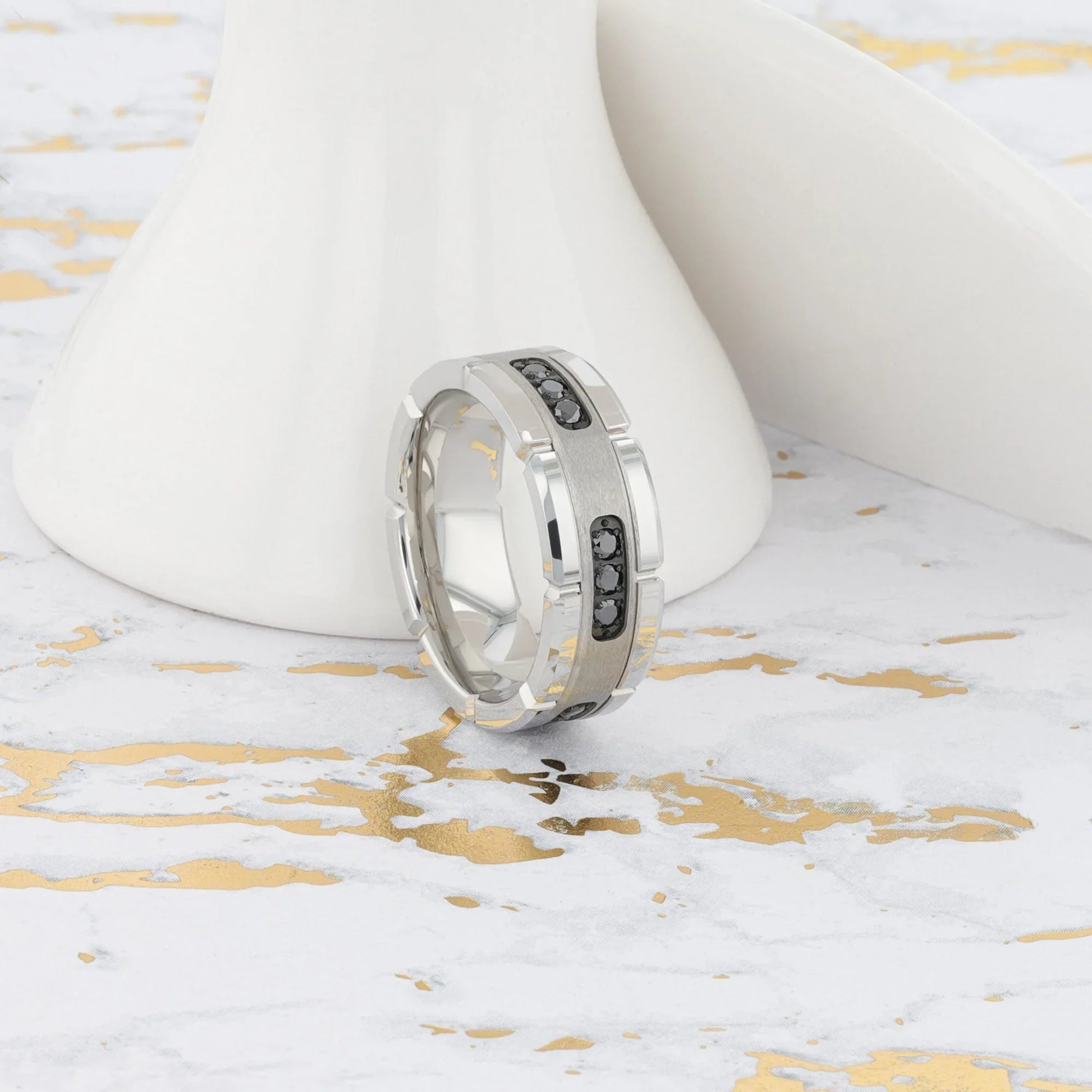 This bold Thorsten Tungsten Carbide ring has a grooved band with polished notches a marvelous silver inlay with inset stunning round-cut, black diamonds. The ring’s nine black diamonds encircle the ring halfway in groups of three.
