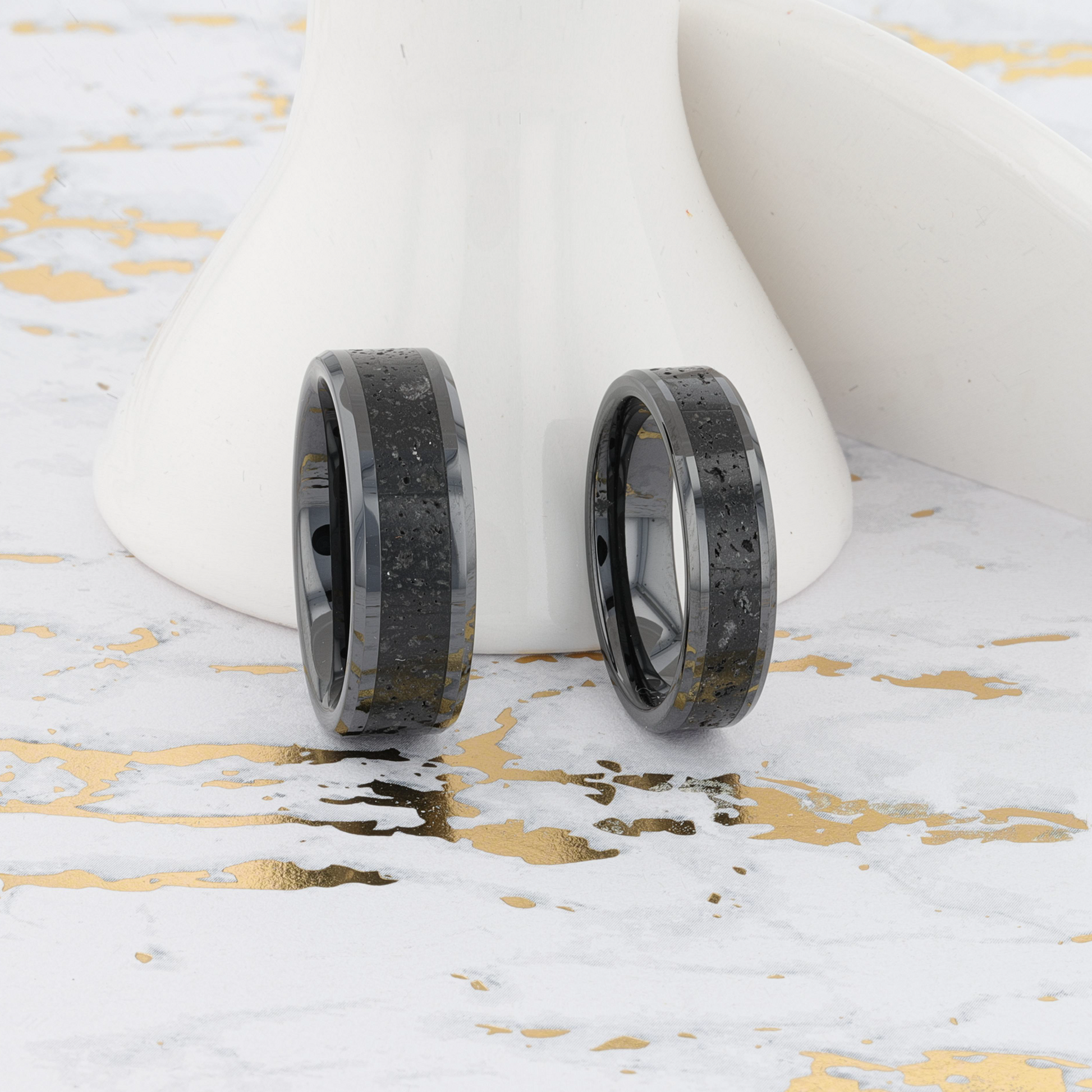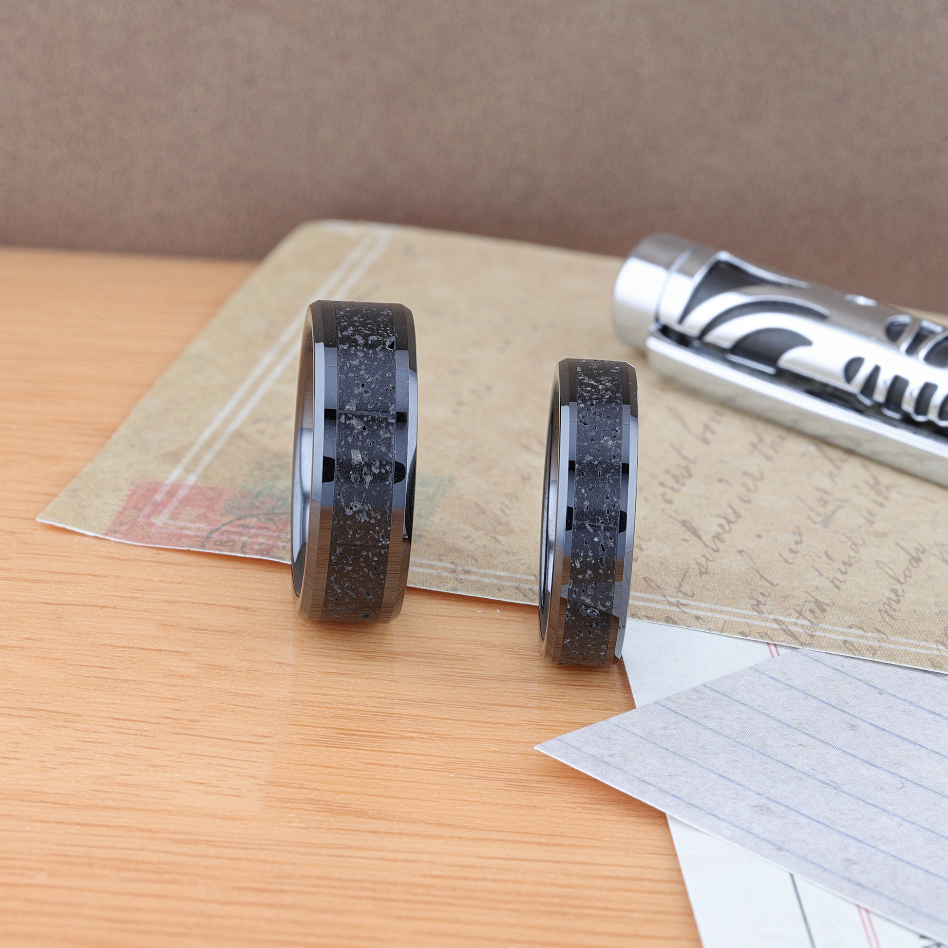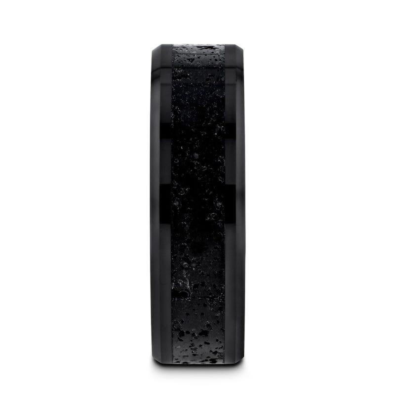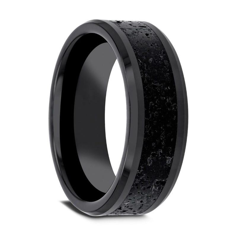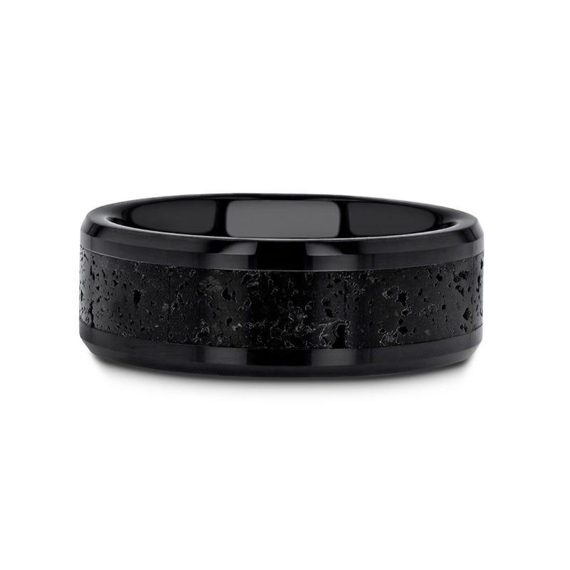 VESUVIUS Men’s Polished Black Ceramic Wedding Band with Black & Gray Lava Rock Stone Inlay & Polished Beveled Edges - 6mm & 8mm