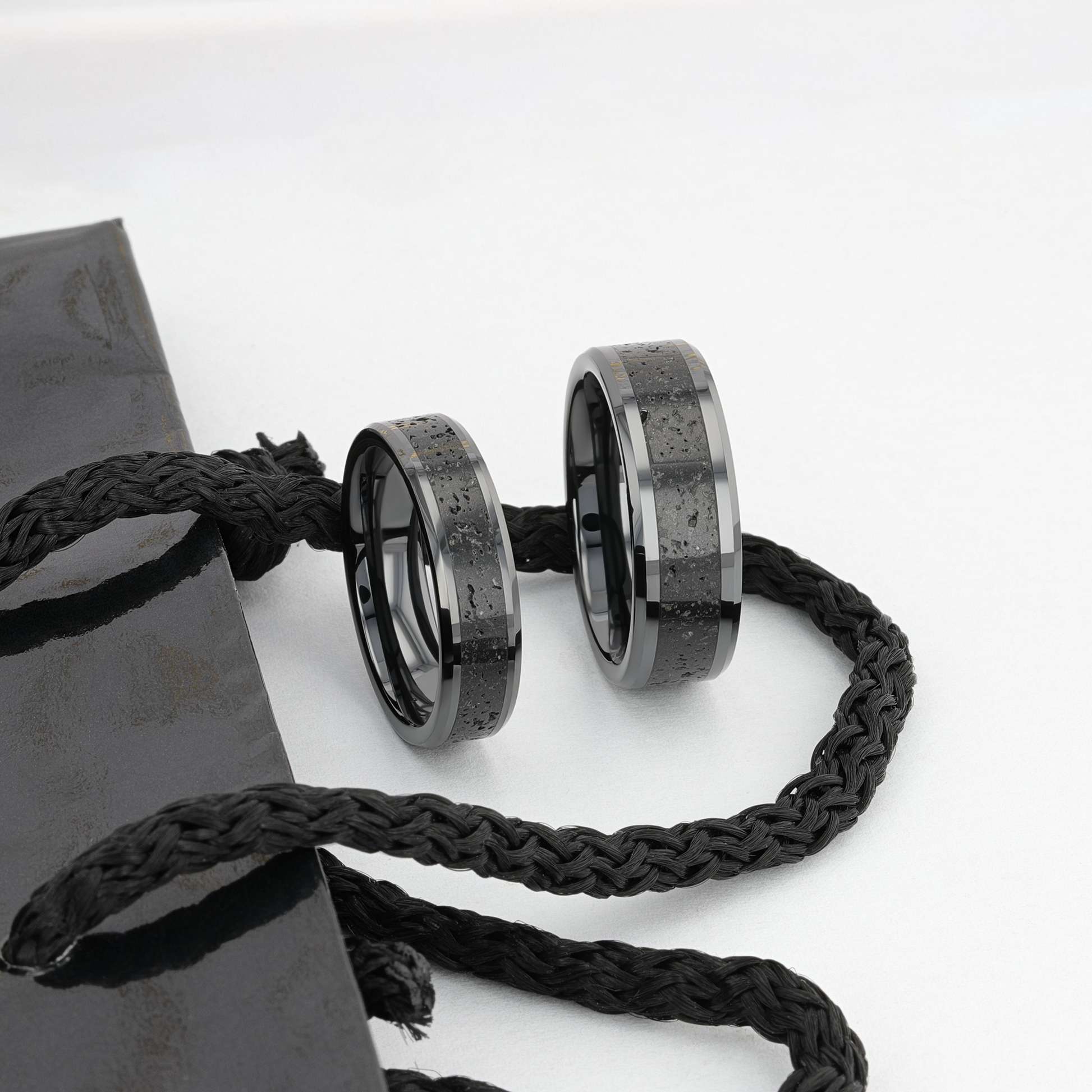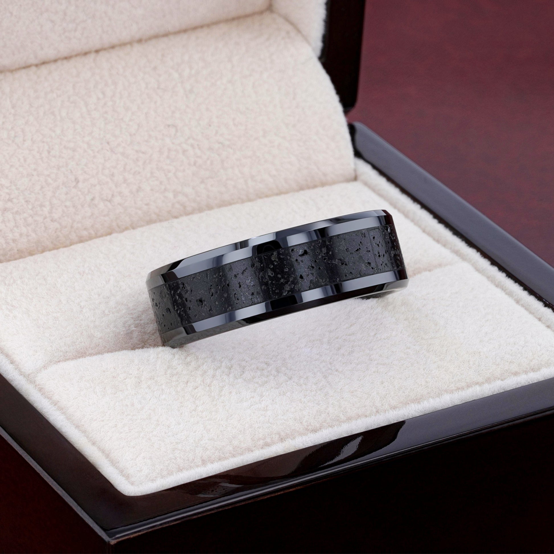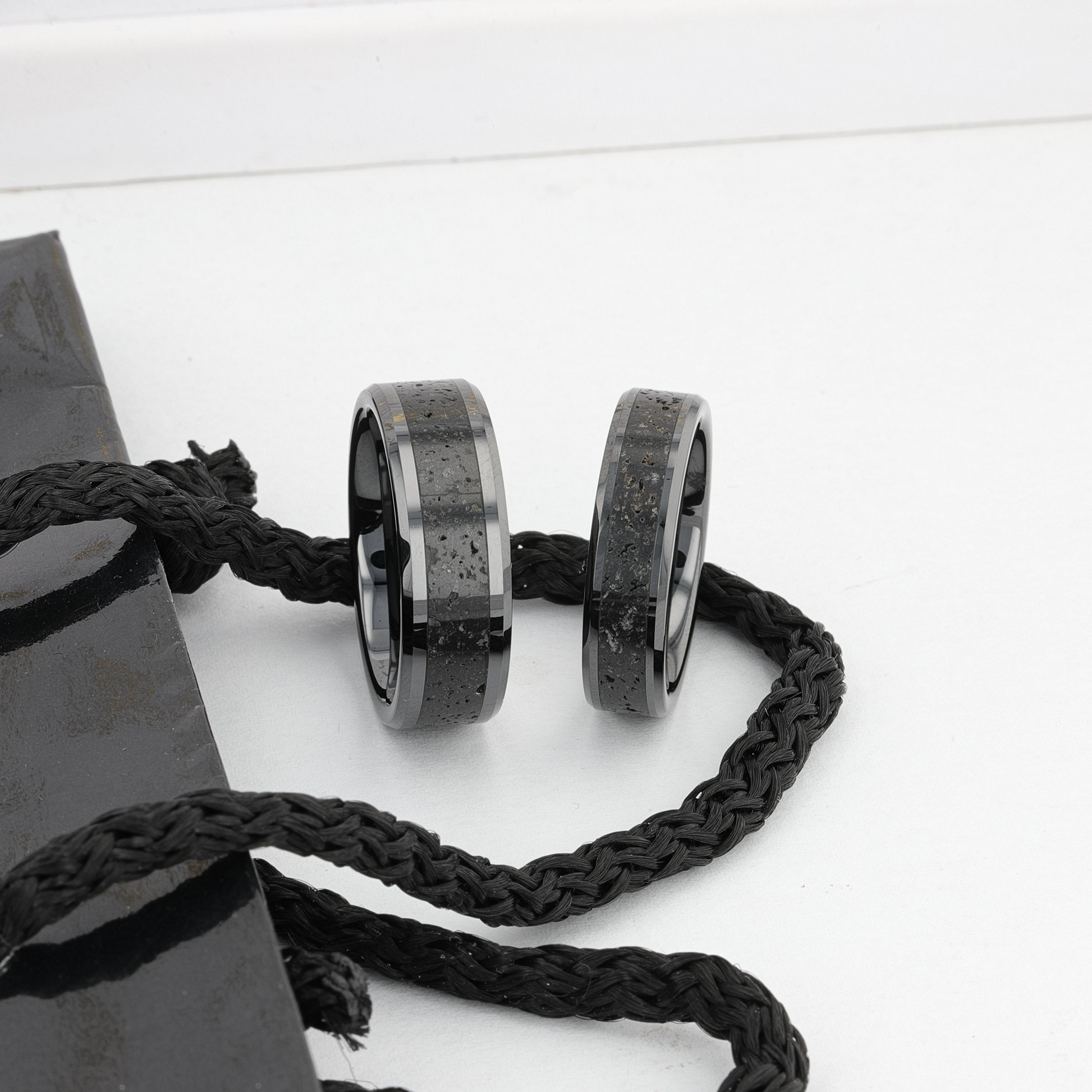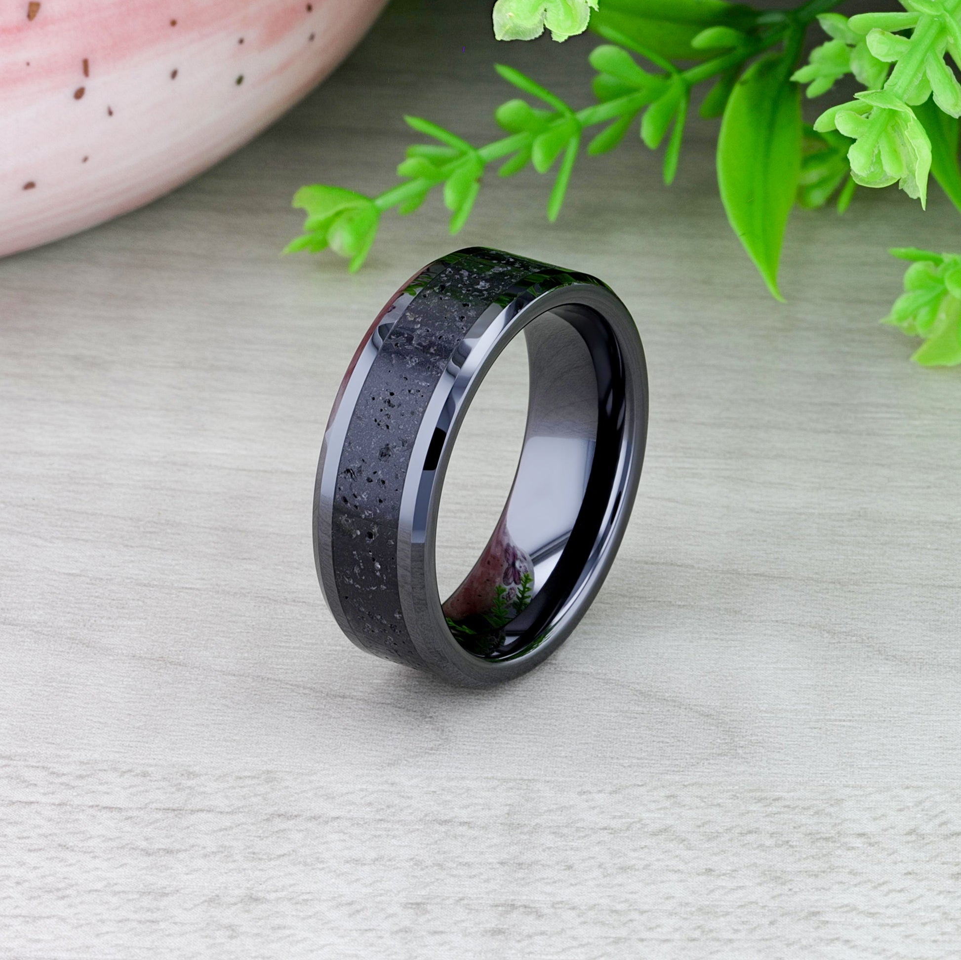 VESUVIUS Men’s Polished Black Ceramic Wedding Band with Black & Gray Lava Rock Stone Inlay & Polished Beveled Edges - 6mm & 8mm