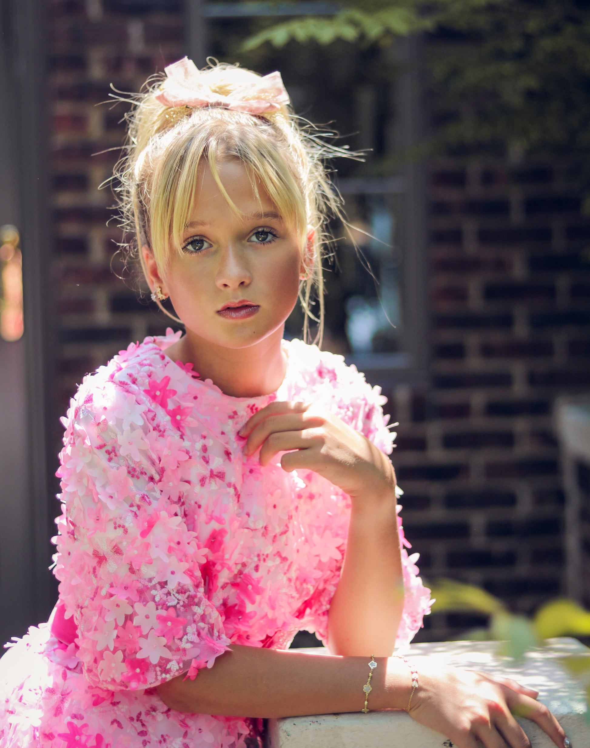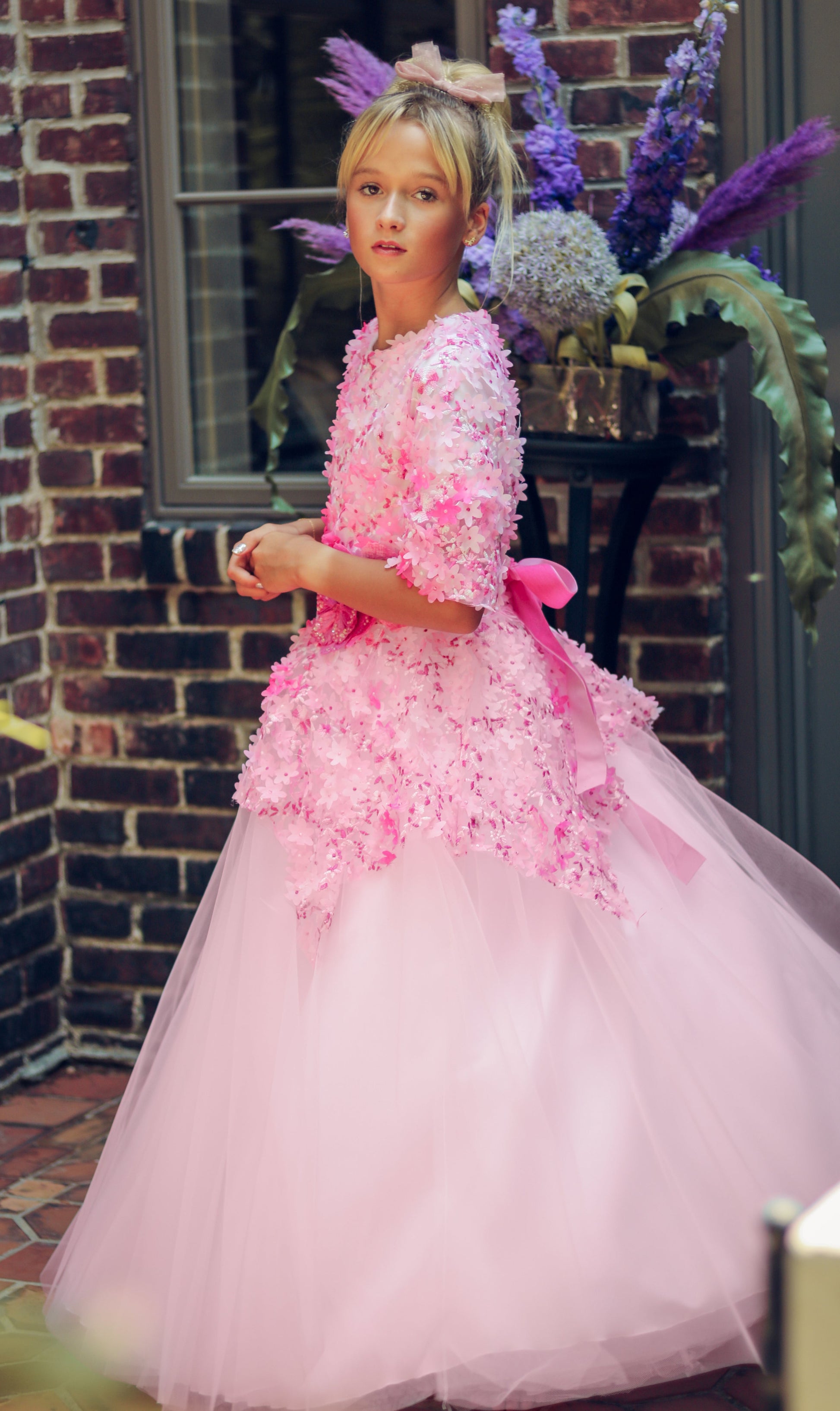 Pink peplum flower dress with blush organza and hot pink ribbon.