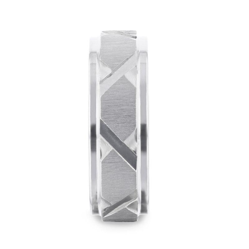 VIRAGE Raised Horizontal Etch and Diagon-Shaped Cuts Centered Titanium Men's Wedding Ring With Polished Step Edges - 8mm