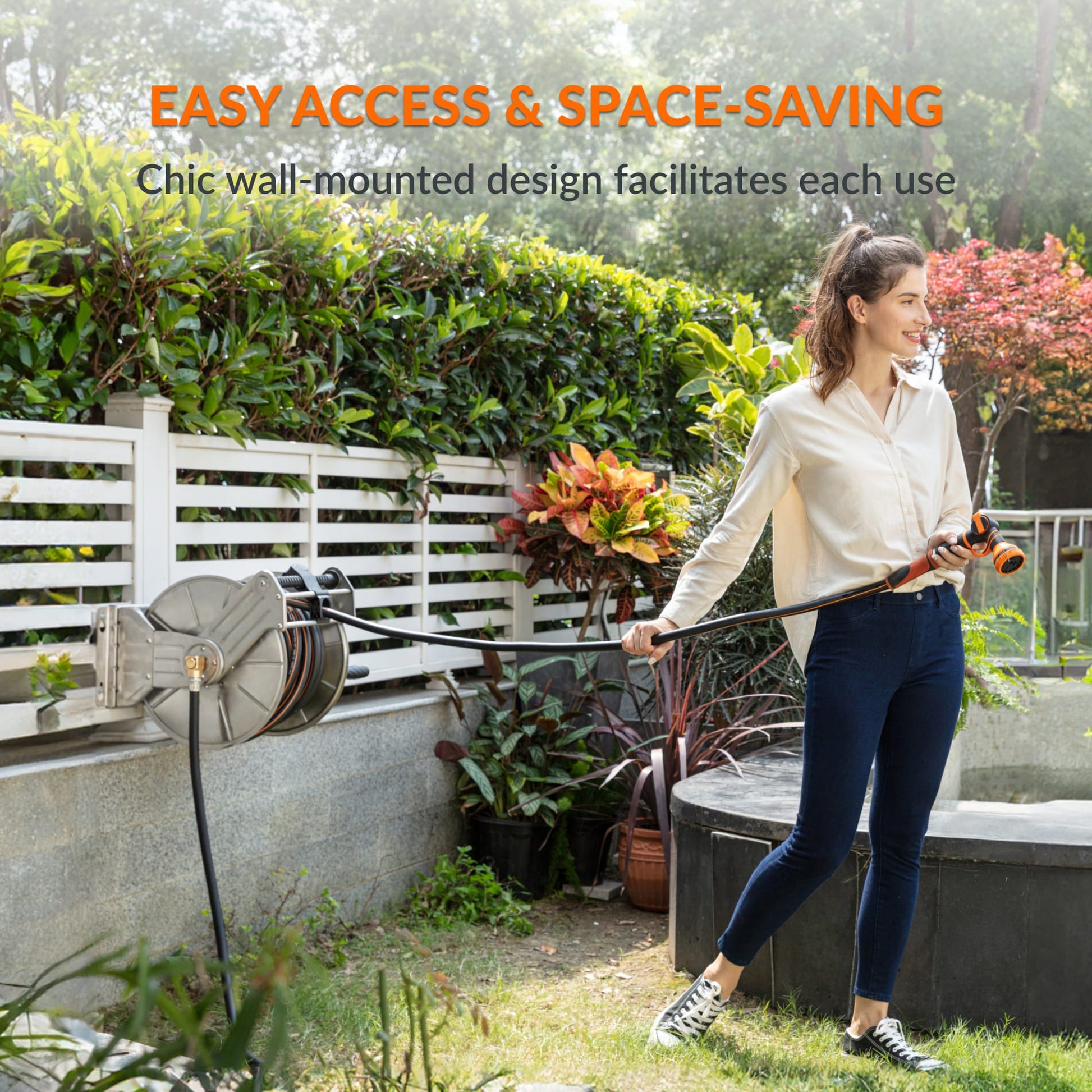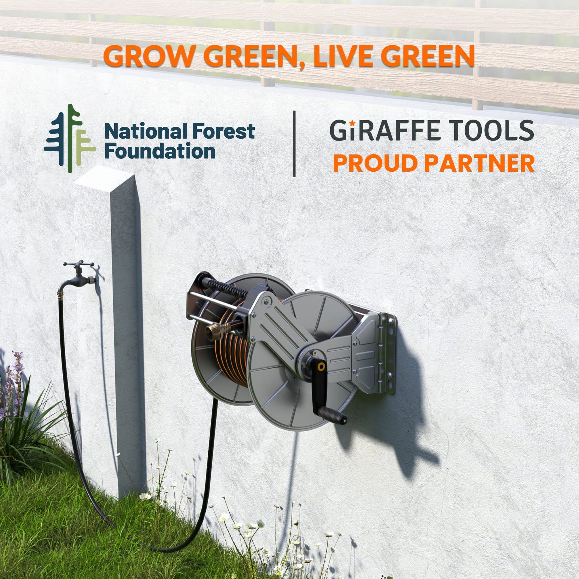 The Giraffe Tools Stainless Steel Hose Reel is made of industrial-grade 304 stainless steel. The crank and solid wall-mounted reel make it very easy to install and use.