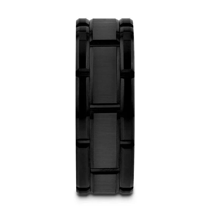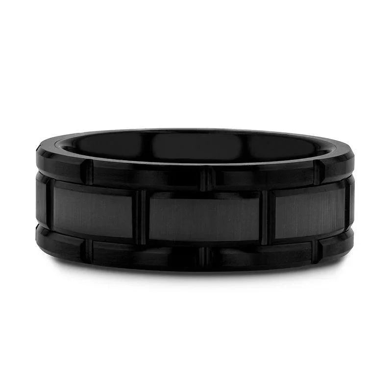 This remarkable, attention-grabbing Black Tungsten Carbide ring design from Thorsten features a beautiful vertically-brushed finish on the center band flanked with carved side band segments with polished beveled edges and can be worn as a wedding band or promise ring.