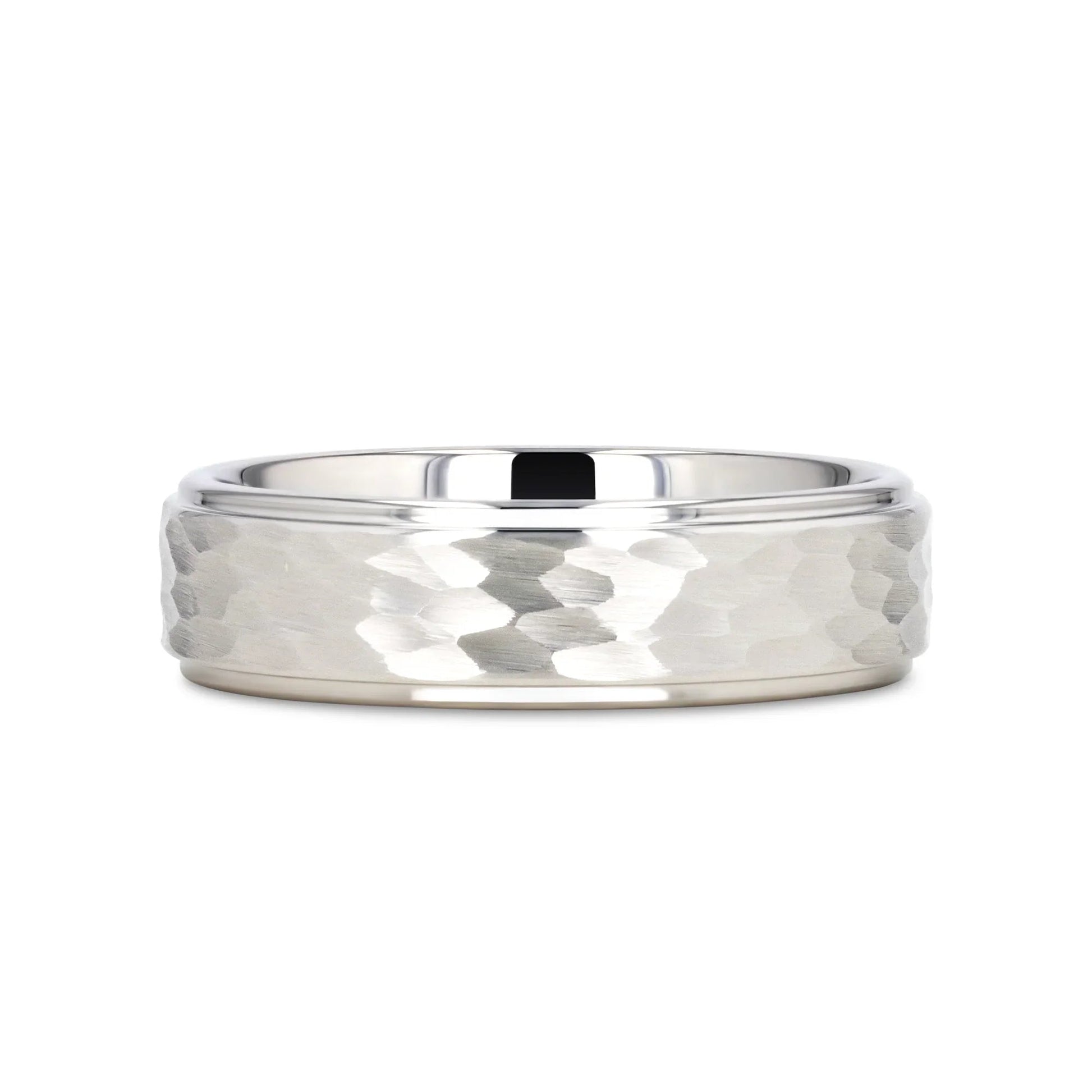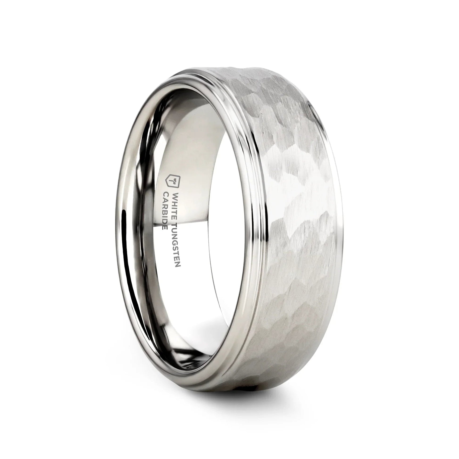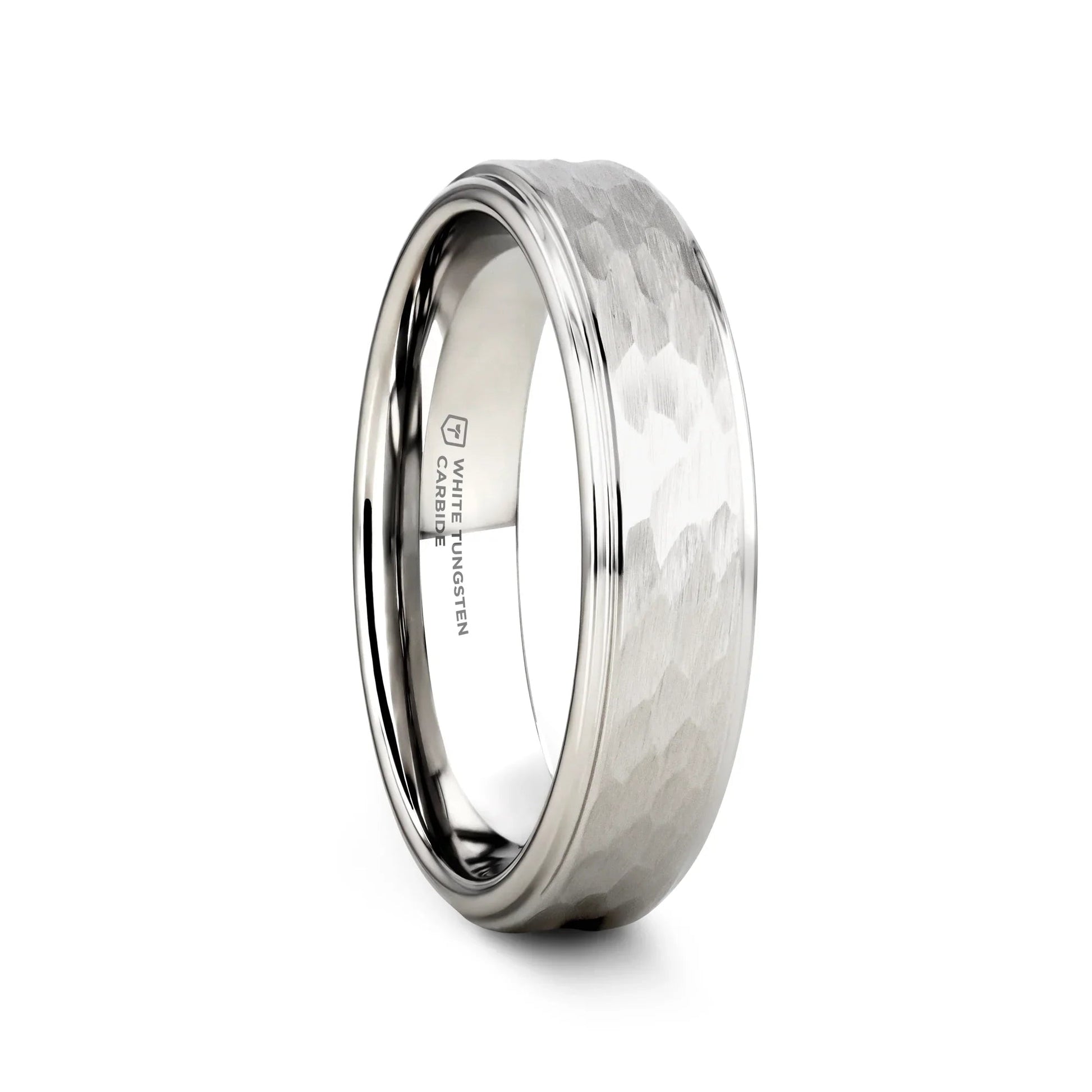 WINSTON White Tungsten Ring with Raised Hammered Finish and Polished Step Edges - 4mm - 10mm