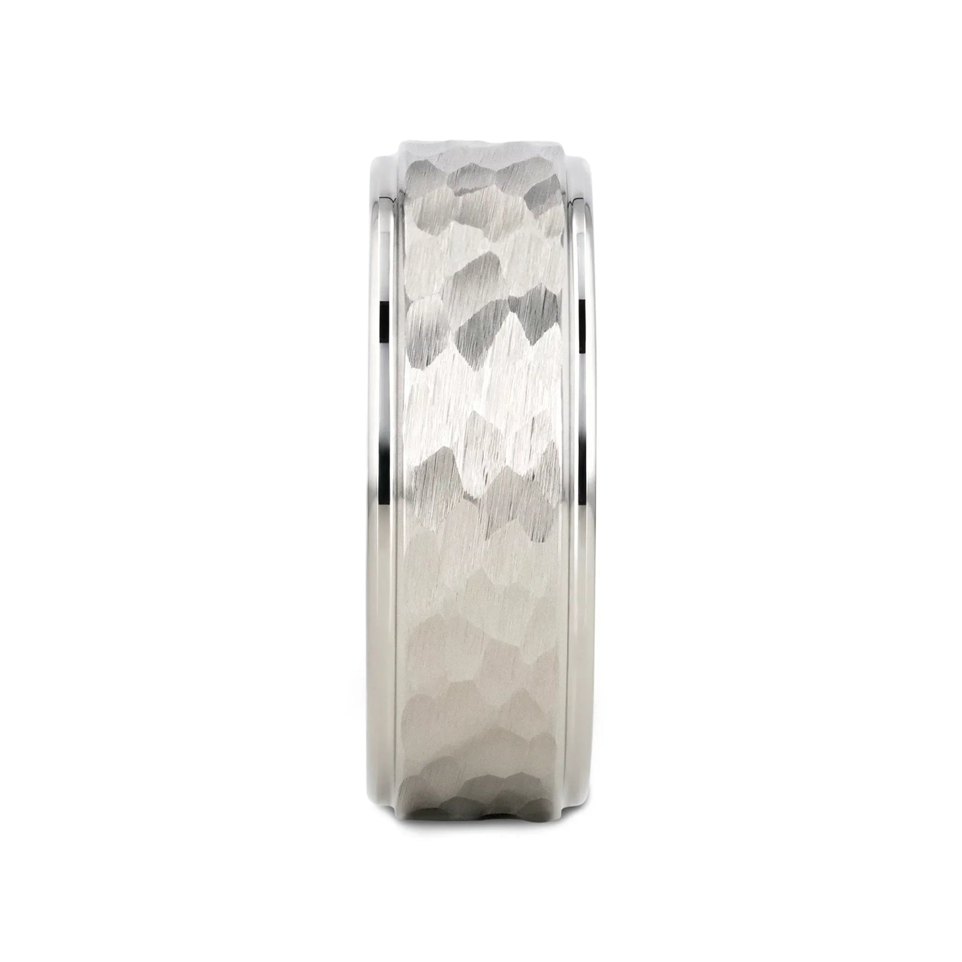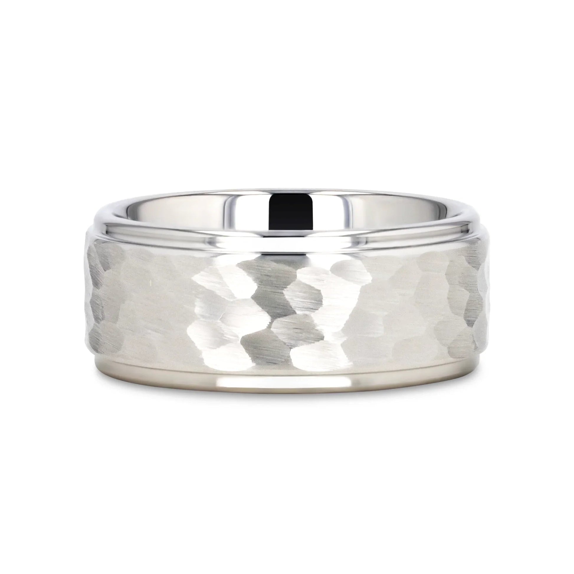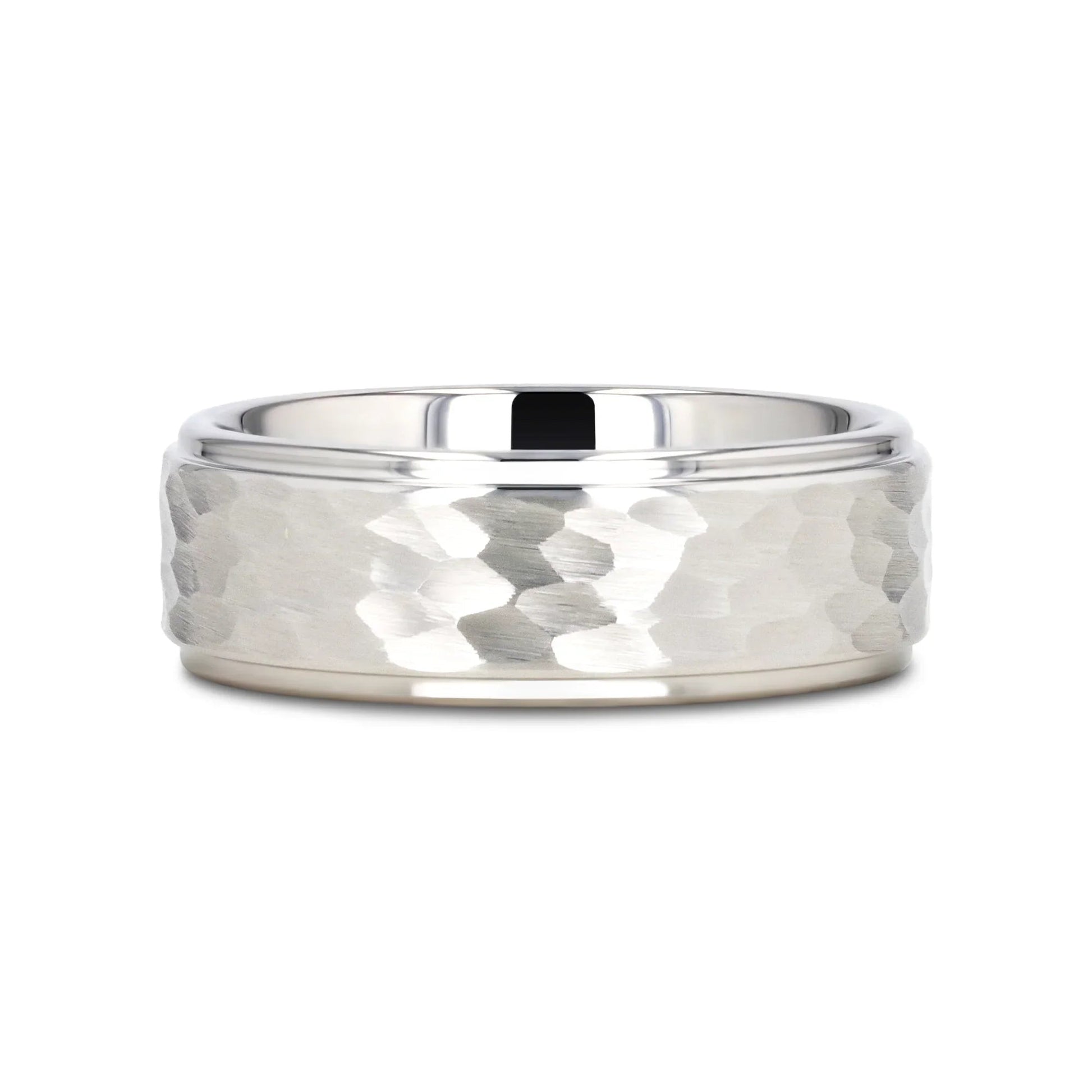 WINSTON White Tungsten Ring with Raised Hammered Finish and Polished Step Edges - 4mm - 10mm