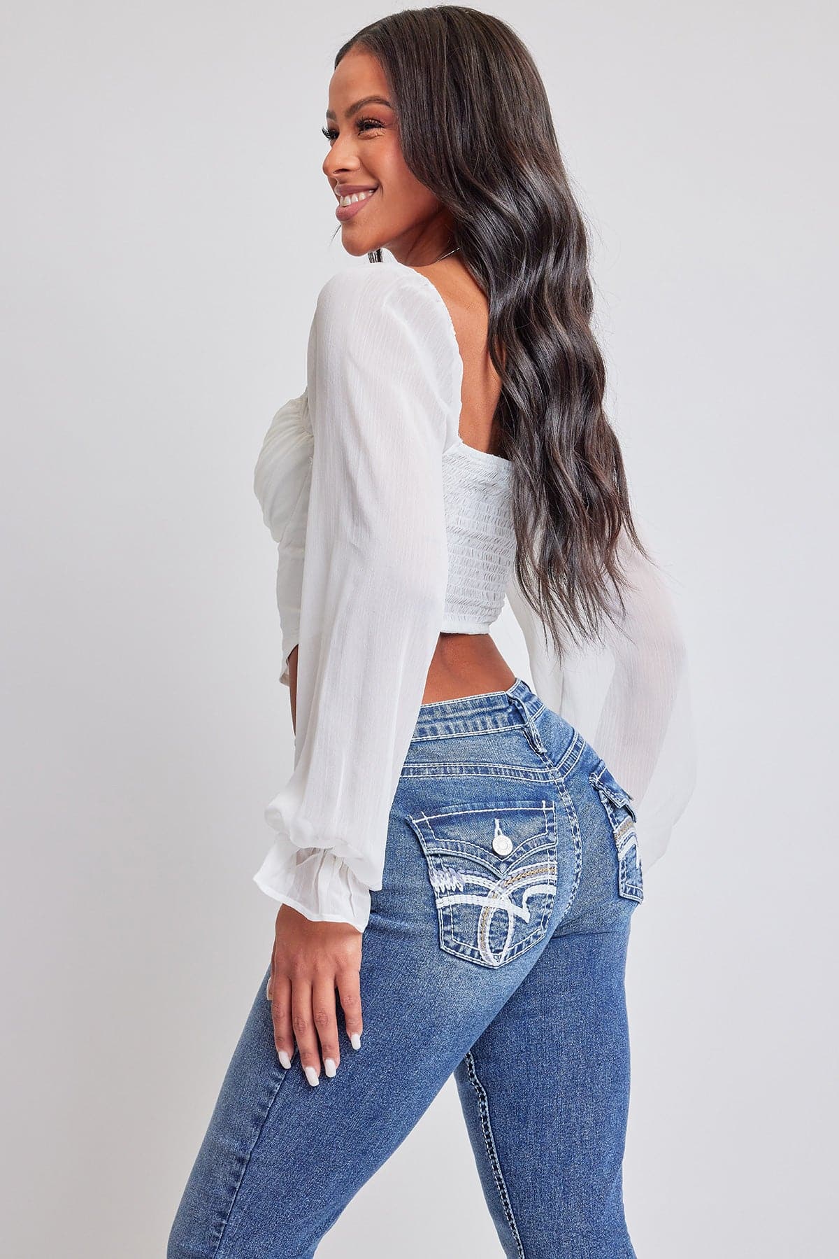 Bring a touch of nostalgia to your wardrobe game in our Women's Premium Stitch Mid-Rise Bootcut Jeans. These jeans combine timeless design with modern details, offering a mid-rise fit, classic 5-pocket style, eye-catching embroidered rear pockets with flap and button closure, and intricate stitching throughout. The boot cut silhouette adds a touch of vintage charm, and the full-length design makes them versatile for any occasion. Dress it up with a crisp white button-down shirt, a statement belt and strappy heels.