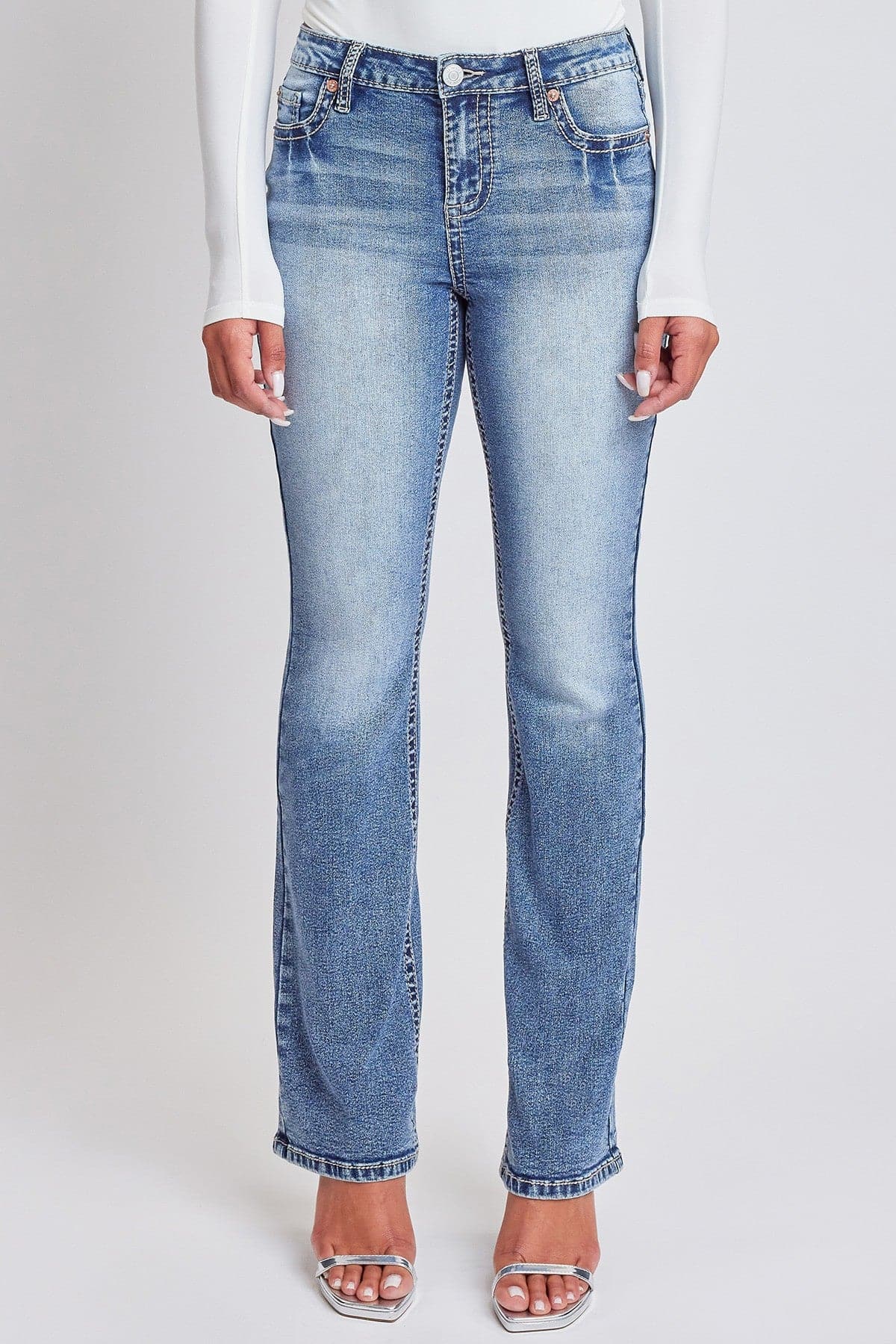 Our Women's Heavy Stitch Bootcut Jeans feature embroidered back pockets and detailed stitching throughout. Embellished with heavy white thread stitching and designed to flatter your figure, these bootcut jeans will elevate your everyday style.