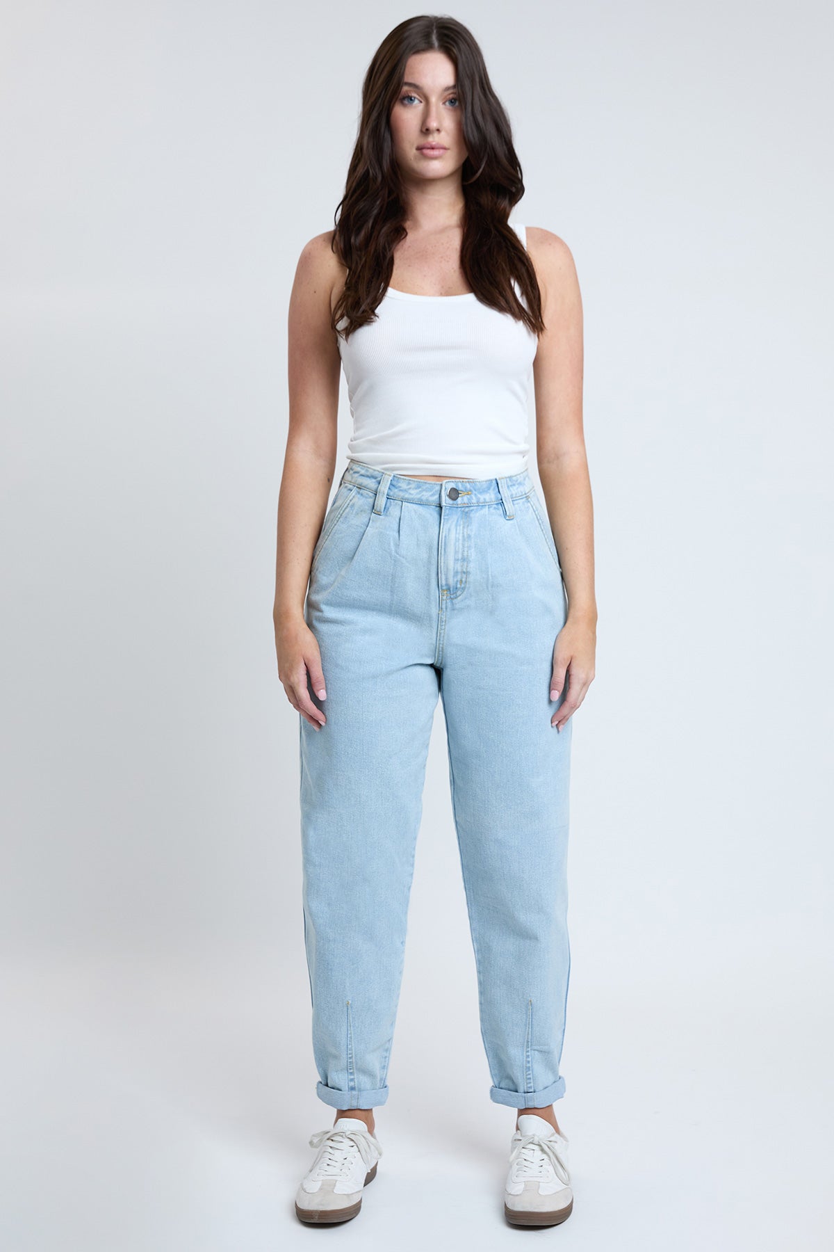 The ultimate pair of vintage-inspired jeans! Our Women's Pleated Mom Jeans are a must-have featuring a high-waist and an exaggerated barrel silhouette. You’ll be sure to make a statement in these! Also featuring a tapered leg, an ankle-length crop, and a cuffed hem for an effortlessly cool look. Since these jeans make a statement, they look amazing with simple pieces like a basic tee! For some extra drama, layer over a trench coat and add some bold heels!