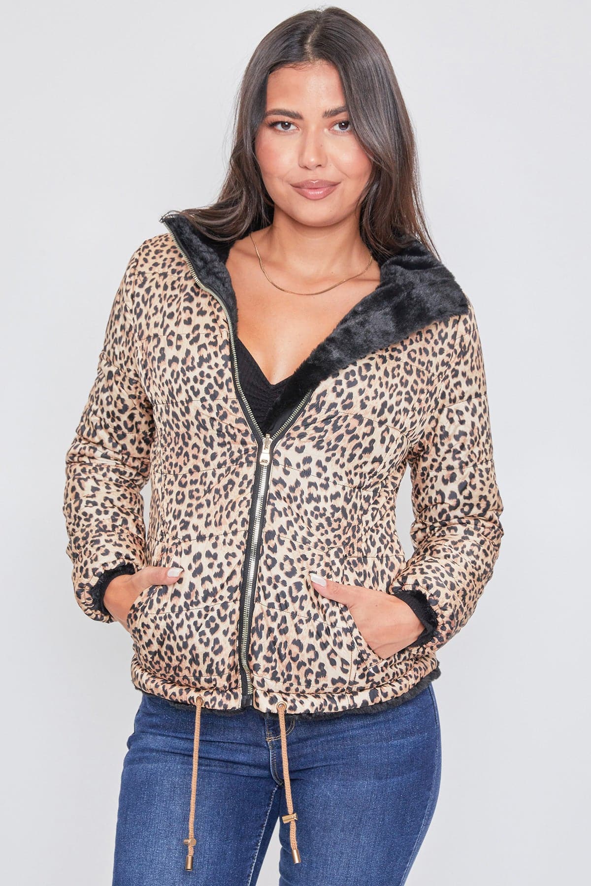 Add some edgy layers to all your go-to outfits this season with our Women's Faux Fur Reversible Jacket with Hoodie. Complete with all standard trademarks: side pockets, hood, faux fur lining, front zip closure, drawstring at hip for comfortable fit, shining hardwear and a reversable option.