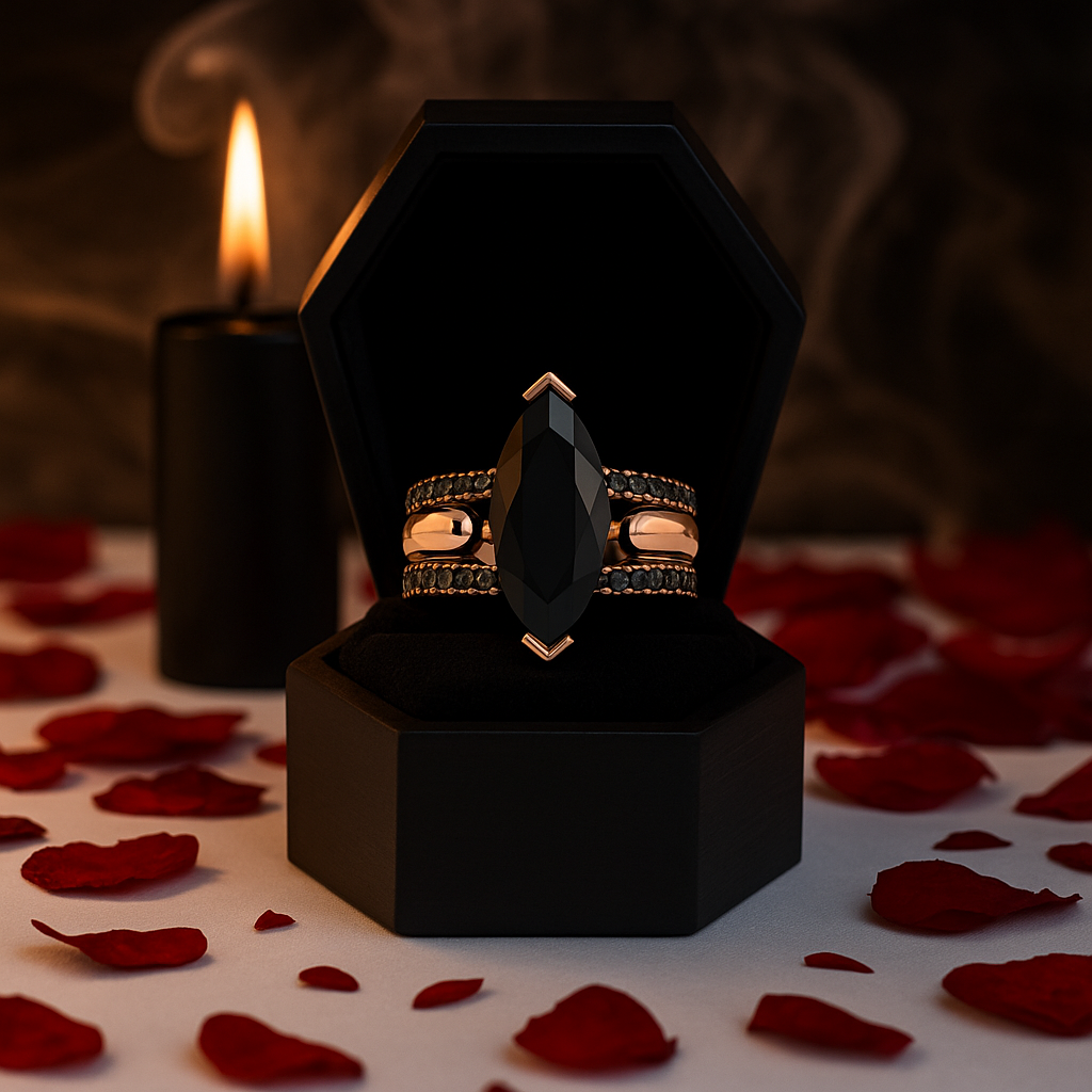 In a forgotten manor, where time stood still, a love was sealed not with words, but with a promise carved in gold. Our "You & Me" rings, fashioned from the warmest 14K rose gold, are a testament to that eternal vow. At the heart of her ring, a brilliant diamond sparkles like a lone star in a midnight sky, embraced by a delicate, intricate design of two skulls gazing into one another's eyes. His band mirrors this deep connection, whispering of a shared fate. This collection speaks to a love so profound it is not afraid of the shadows, a bond that is both beautiful and haunting, proving that true love lasts far beyond the veil.